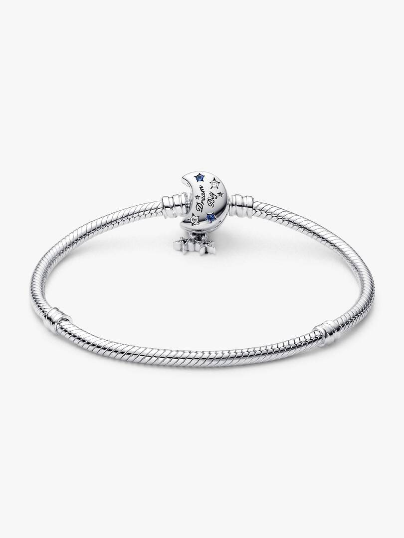 Dale un toque celestial a tu look con esta pulsera con cierre de luna de la colección Moments. Elaborada en plata de ley, la pulsera presenta la icónica cadena de serpiente y un cierre de luna creciente. La luna está adornada con un diseño de estrellas pulidas y recortadas, adornadas con circonitas cúbicas transparentes y cristales azules sintéticos. Dos estrellas individuales cuelgan del cierre, que lleva grabado "Dream Big" en la parte posterior. Llévala para llevar contigo la belleza del cielo estrellado y contar tu historia y tus sueños.