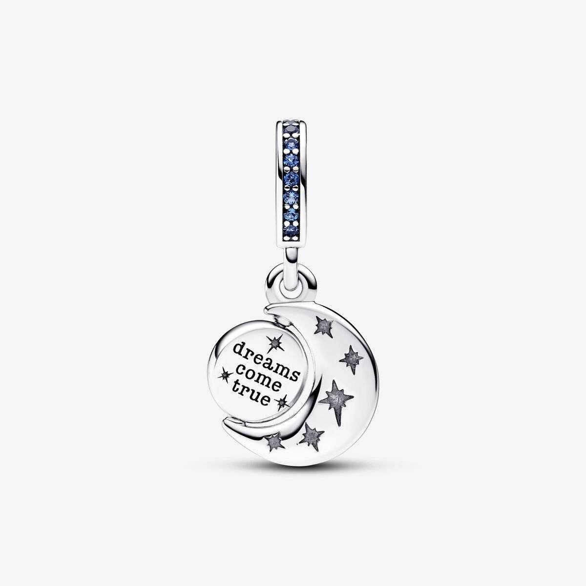 Celebra la belleza del cielo nocturno con este dije colgante de Luna Giratoria. Elaborado en plata de ley, este dije presenta una luna creciente adornada con cristales cabujón redondos sintéticos en tres tonos de azul. Dentro de la luna creciente se encuentra un pequeño disco giratorio de plata de ley, pintado con esmalte azul brillante por un lado y grabado con la palabra "Dreams Come True" por el otro. Lleva este dije colgante como recordatorio para perseguir tus sueños, todos los días.