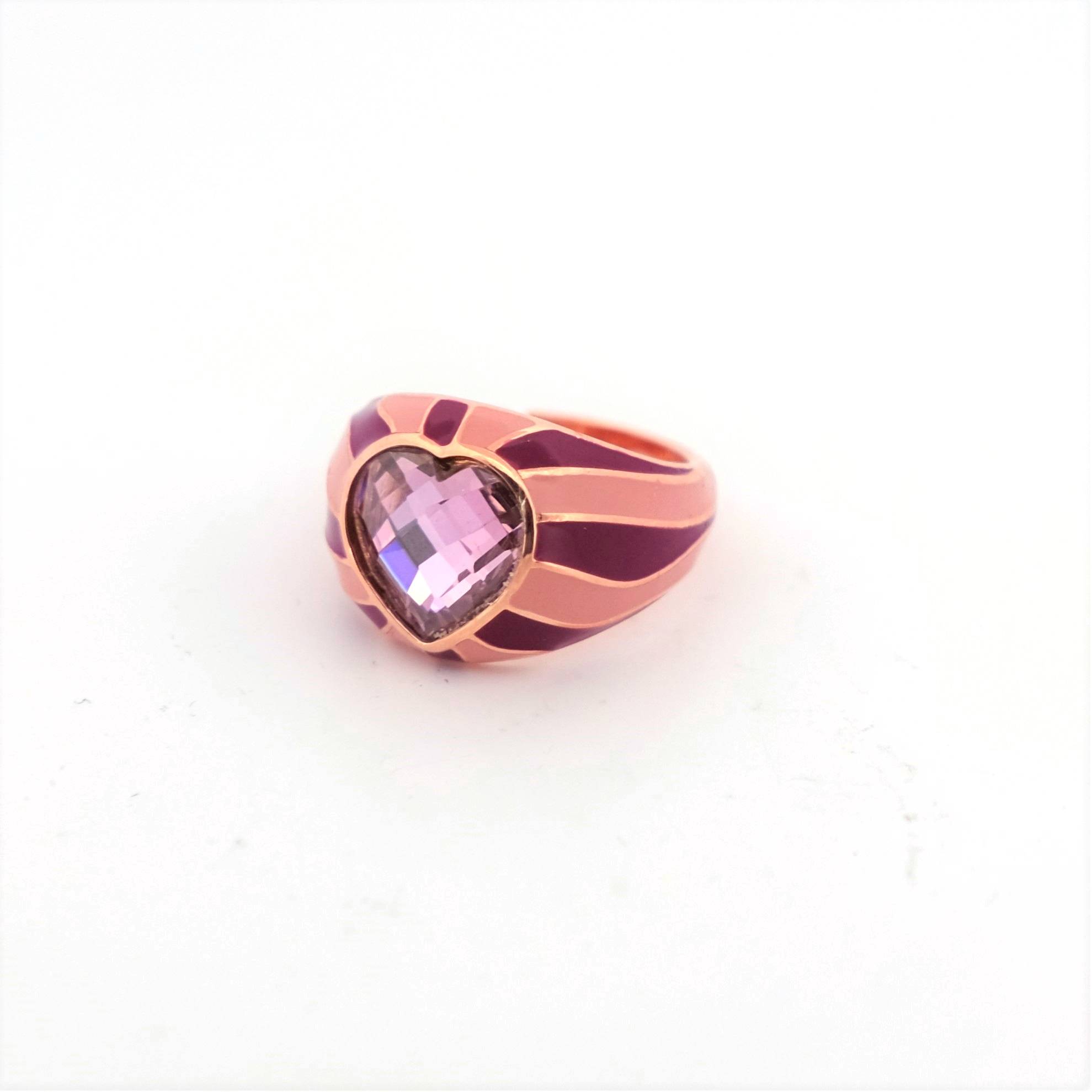 Este anillo luce una colorida circonita con corte de corazón y un diseño de efecto cebra. Su talla es ajustable gracias a su cuerpo abierto.