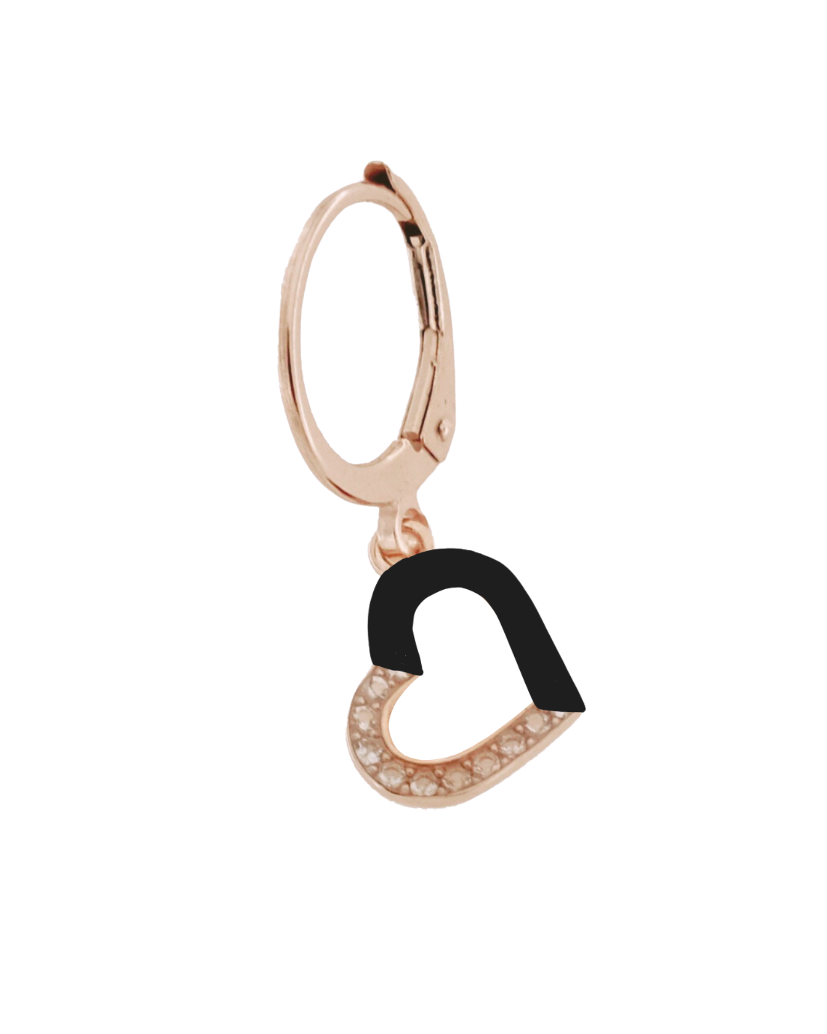 Pendiente individual de oro rosa con colgante de corazón de esmalte negro adornado con brillantes piedras de circonitas cúbicas blancas.