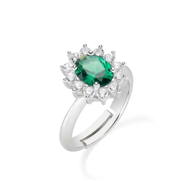 L'anello con pietra Verde (dalla misura regolabile) realizzato in argento 925, è un classico amato da tutte le donne. Grazie al suo fascino intramontabile è tra i gioielli più regalati per sugellare un legame perché la pietra, per il suo colore caratteristico, è associata ai concetti di rinascita, speranza e fiducia. Inoltre, il contorno di pietre di zirconia bianche impreziosisce e, al tempo stesso, mette in risalto il colore intenso e profondo della pietra.