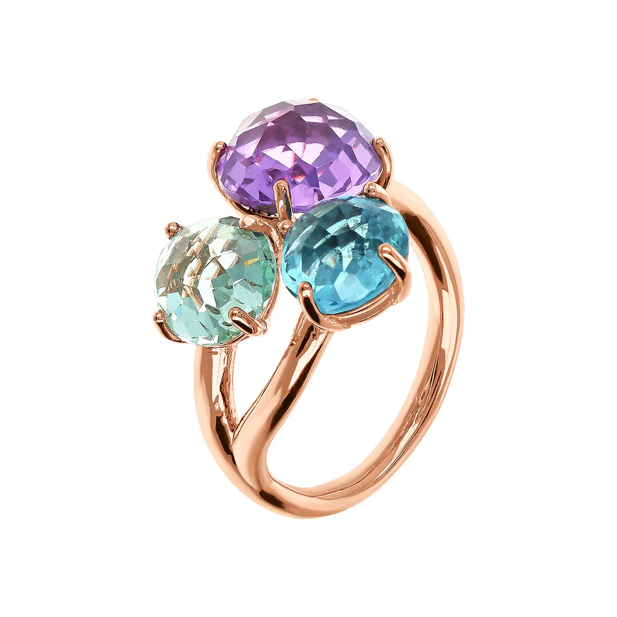 Anello trilogy Bronzallure realizzato in lega Golden Rosé, placcata Oro rosa 18kt, impreziosito da tre pietre prisma gem tonde (8/10 mm) dal taglio a mosaico.
