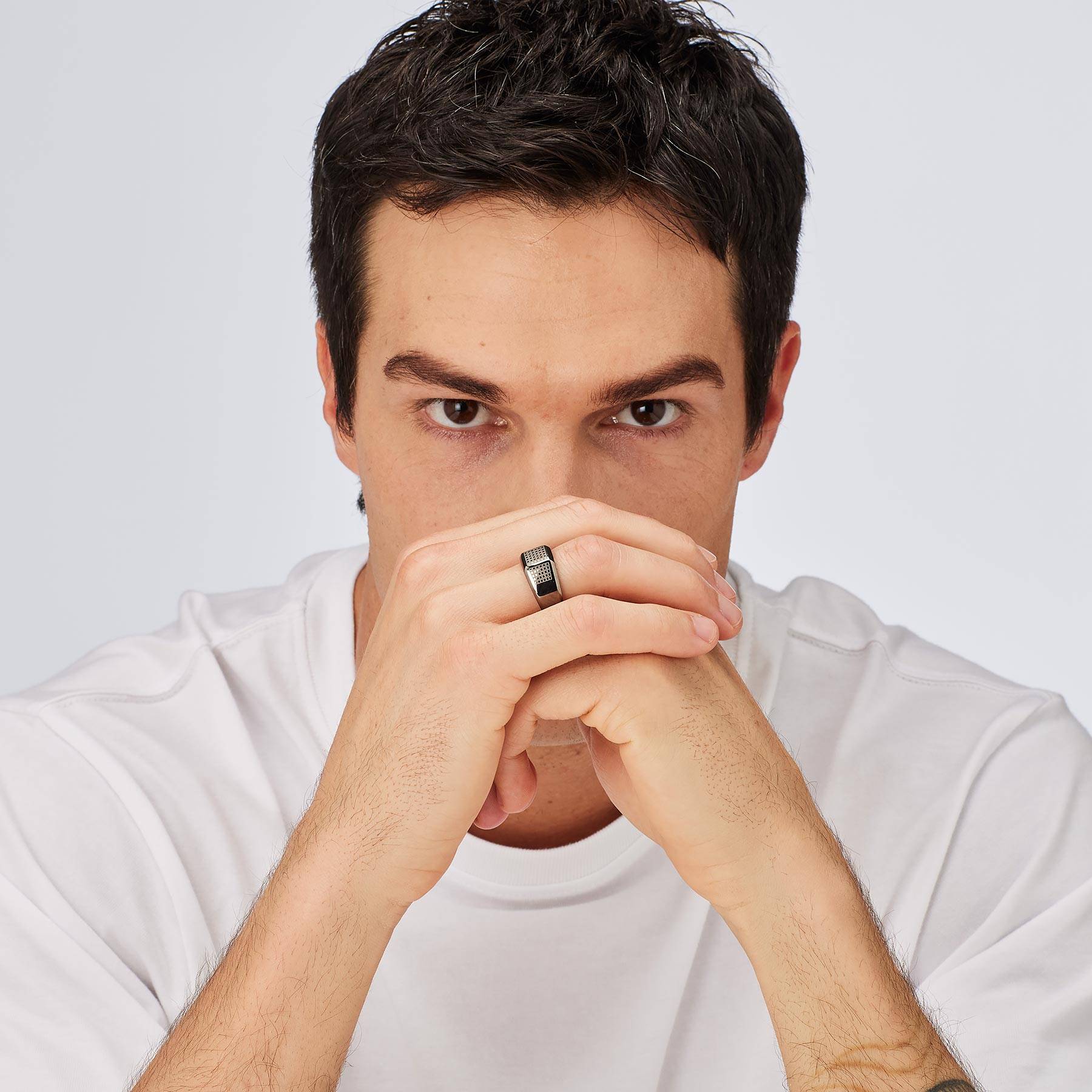 Anello sigillo in acciaio 316L lucido e sabbiato con finitura pvd colore rutenio.