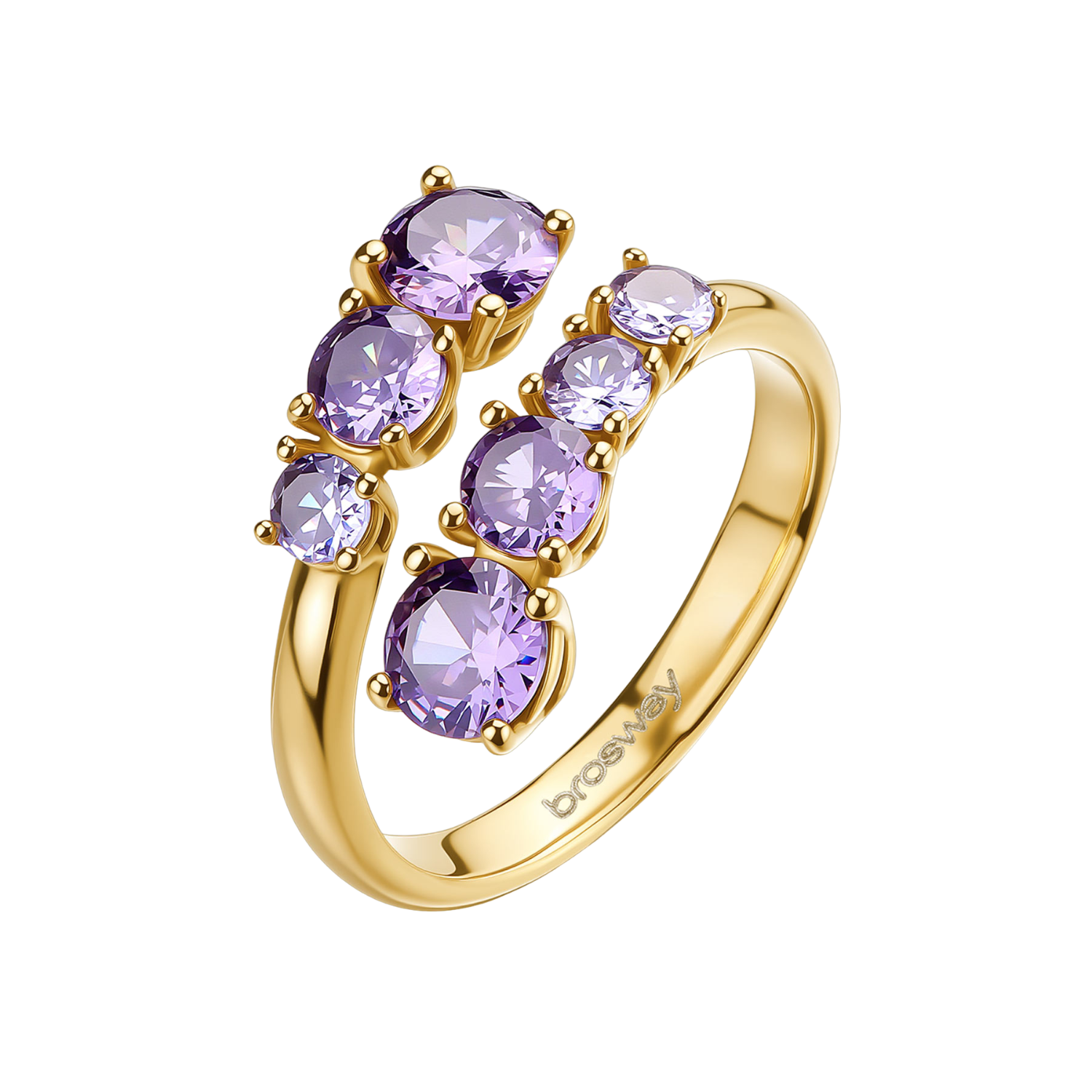 Anello contrarié in acciaio 316L e finitura pvd oro 14K, con cubic zirconia round e cushion colore ametista.