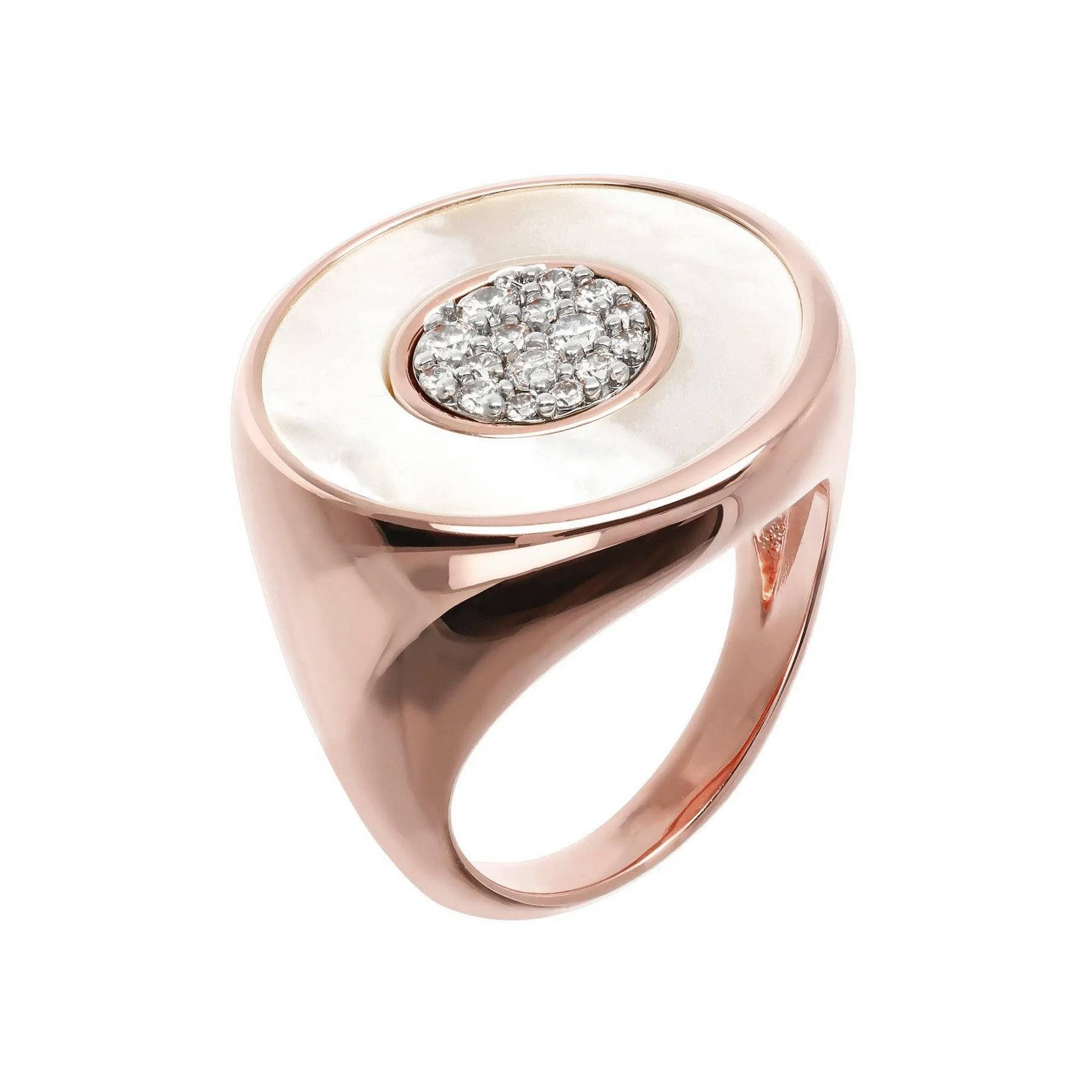 Un anello chevalier bicolore con doppio sigillo che abbina a un pavé circolare di cubic zirconia o spinello nero la pietra naturale. Un gioiello in Golden Rose, placcato oro rosa 18 carati, luminoso ed elegante. Abbina questo anello alle collane, agli orecchini o ai bracciali con pavé della collezione Altissima e completa il tuo look.