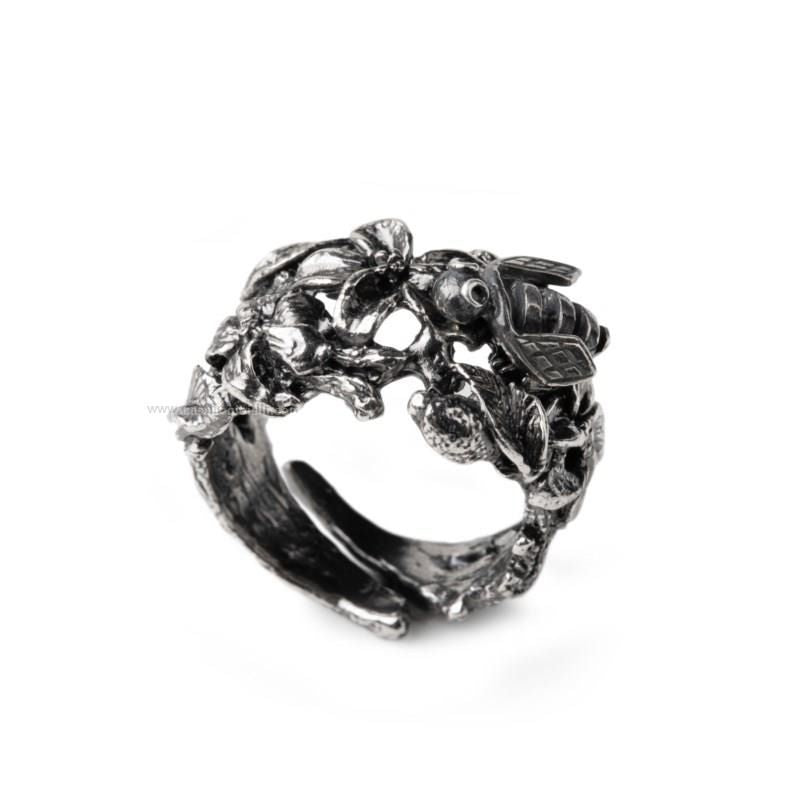 Gioiello realizzato in argento 925 placcato rutenio. Una farfalla si posa su un intreccio di fogli e fiori, su un anello i cui dettagli raccontano la naturale bellezza di un giardino segreto. Un gioiello che è una piccola opera realizzata a mano in Sicilia, con cura e passione.