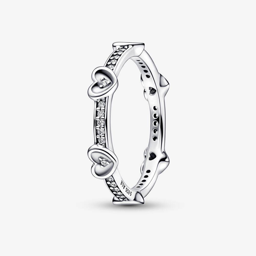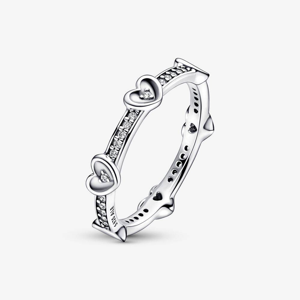 Amore eterno. Rifinito a mano e realizzato in Argento Sterling 925, il nuovo anello Cuori Splendenti è caratterizzato da una fila di cuori in rilievo, ognuno decorato da una pietra di zirconia cubica incolore con taglio brillante rotondo e collegato da un pavé scintillante. Per il tuo solo e unico amore.