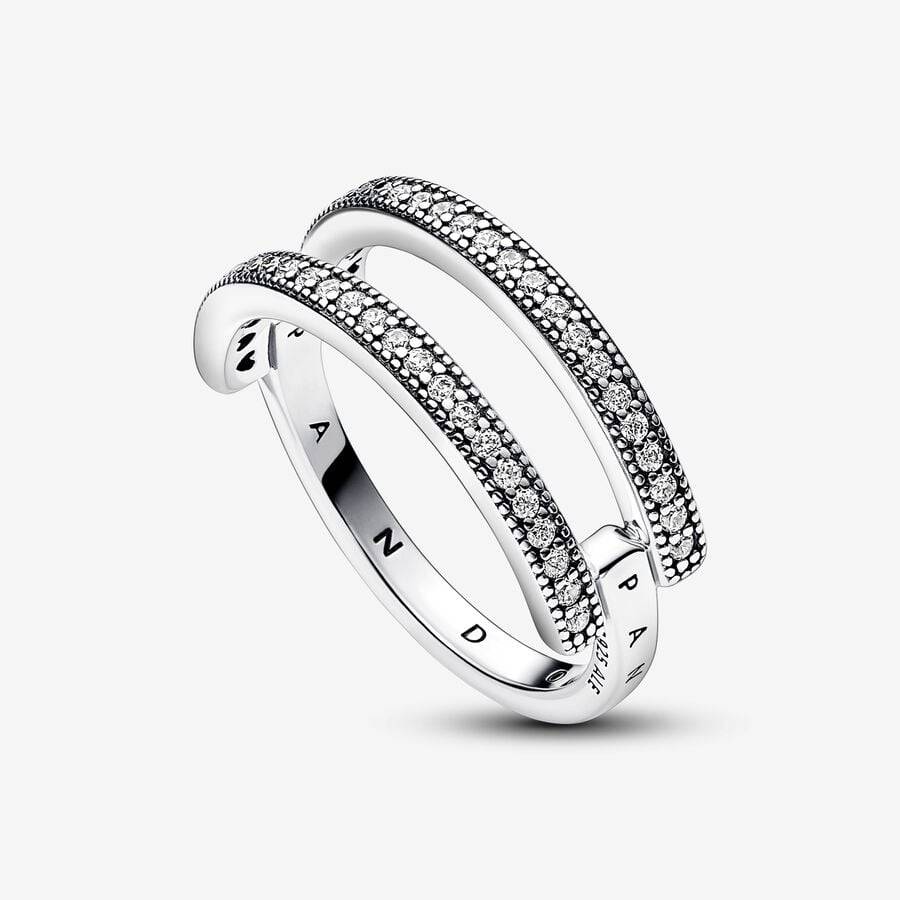 Rinnova la tua combinazione di gioielli con questo Anello Doppia Fascia Logo e Pavè. La forma unica di questo anello in Argento Sterling 925 lo rende unico: una metà presenta due fasce separate decorate da file di pavé incorniciate da micro-sfere, mentre l’altra metà presenta una fascia singola al cui interno è inciso il logo Pandora.