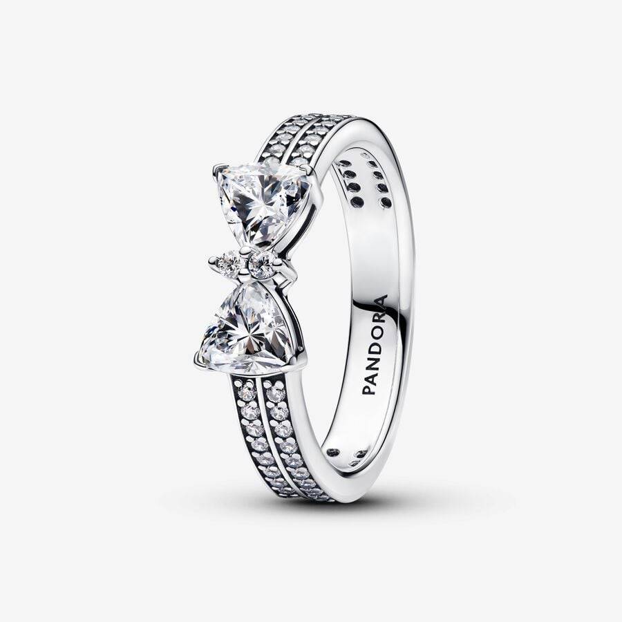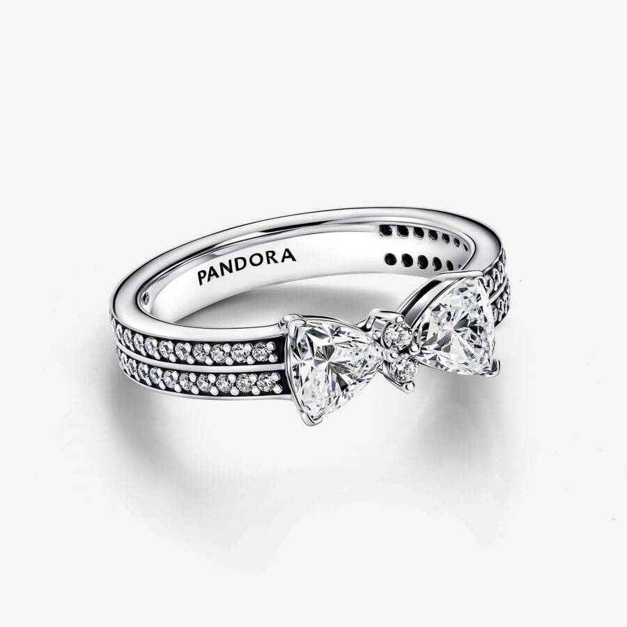Il fiocco presenta due pietre taglio trillion a rebbi e due piccole pietre rotondi taglio brillante incastonati al centro;doppia fila di pavé sulla parte esterna semianteriore della fascia.