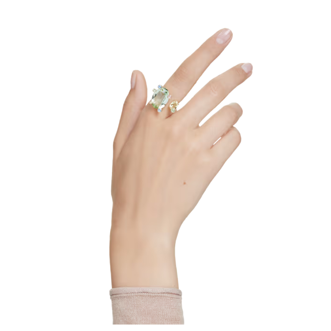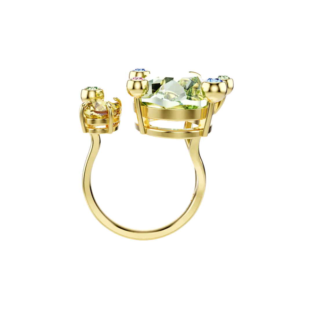 Lo spirito eclettico della famiglia Gema prende vita con gioia in questo anello aperto a fascia. Il design placcato in tonalità oro presenta due cristalli principali in verde e giallo, circondati da cristalli multicolori più piccoli in una montatura a griffe a bolle. Un look effervescente per i giorni in cui vuoi che il tuo stile abbia un tocco pop.