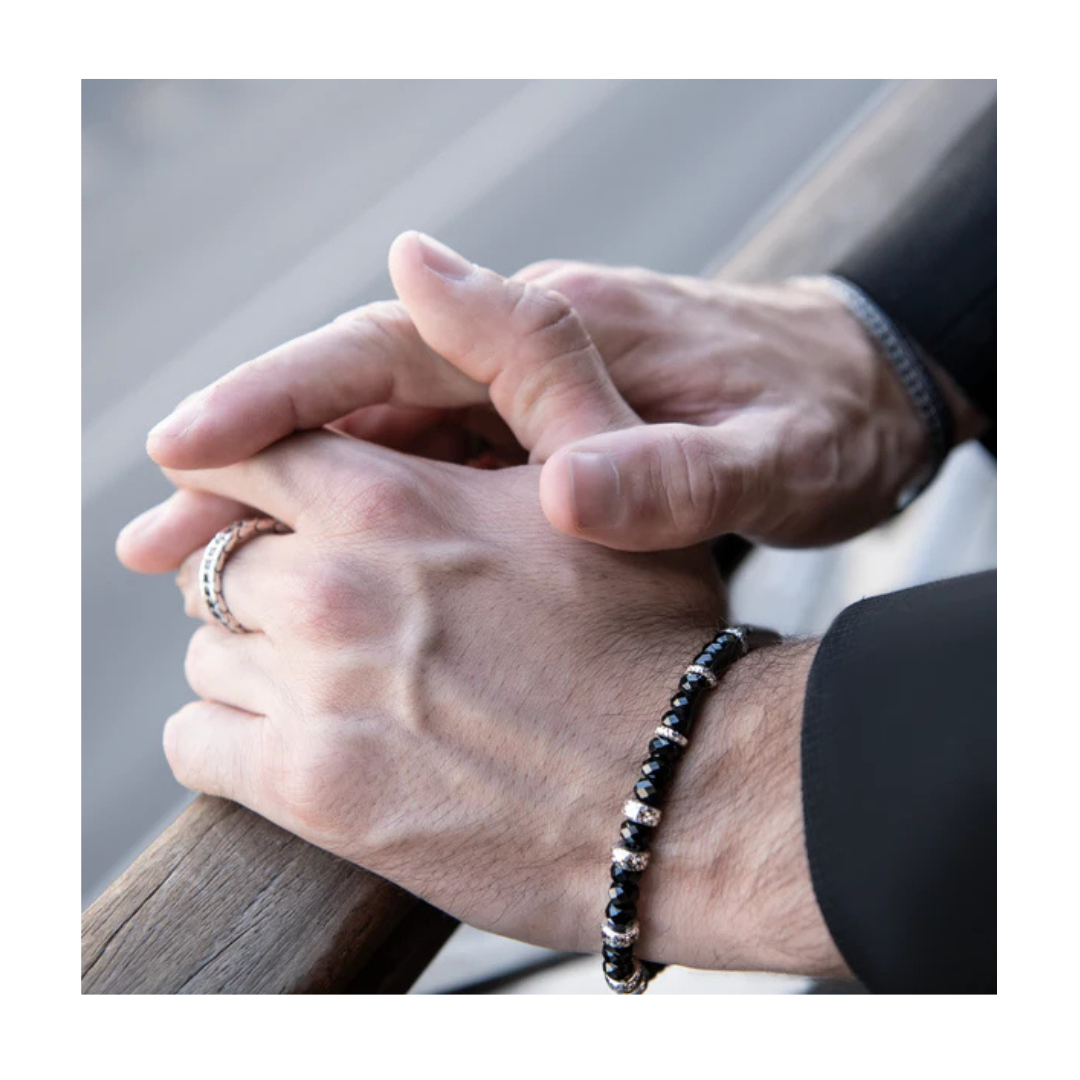 Bracciale uomo Albert M. realizzato in argento 925 con pietre naturali sfaccettate alternate a rondelle dalla texture sirena che richiama il moschettone della chiusura.