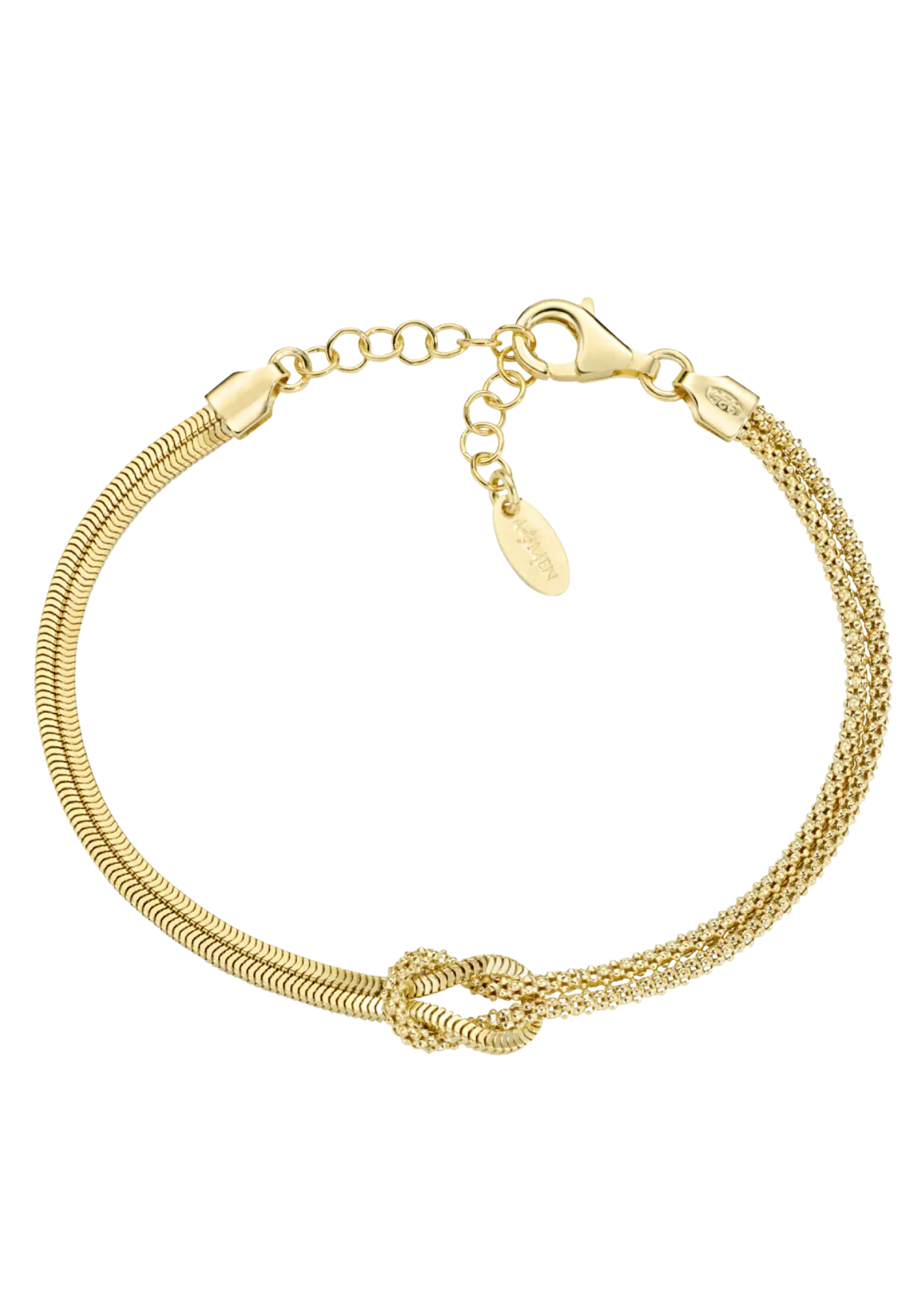 Bracciale in argento 925 dorato con due catene unite a formare un nodo centrale. Il Bracciale Nodo d'Amore è il simbolo tangibile di ogni legame indissolubile. Celebra l'intreccio unico con la tua persona del cuore e racconta il sentimento che vi unisce. Il bracciale è disponibile in tre misure e in tre diverse finiture, per poter rappresentare tutte le sfumature dell'affetto e dell'amore.