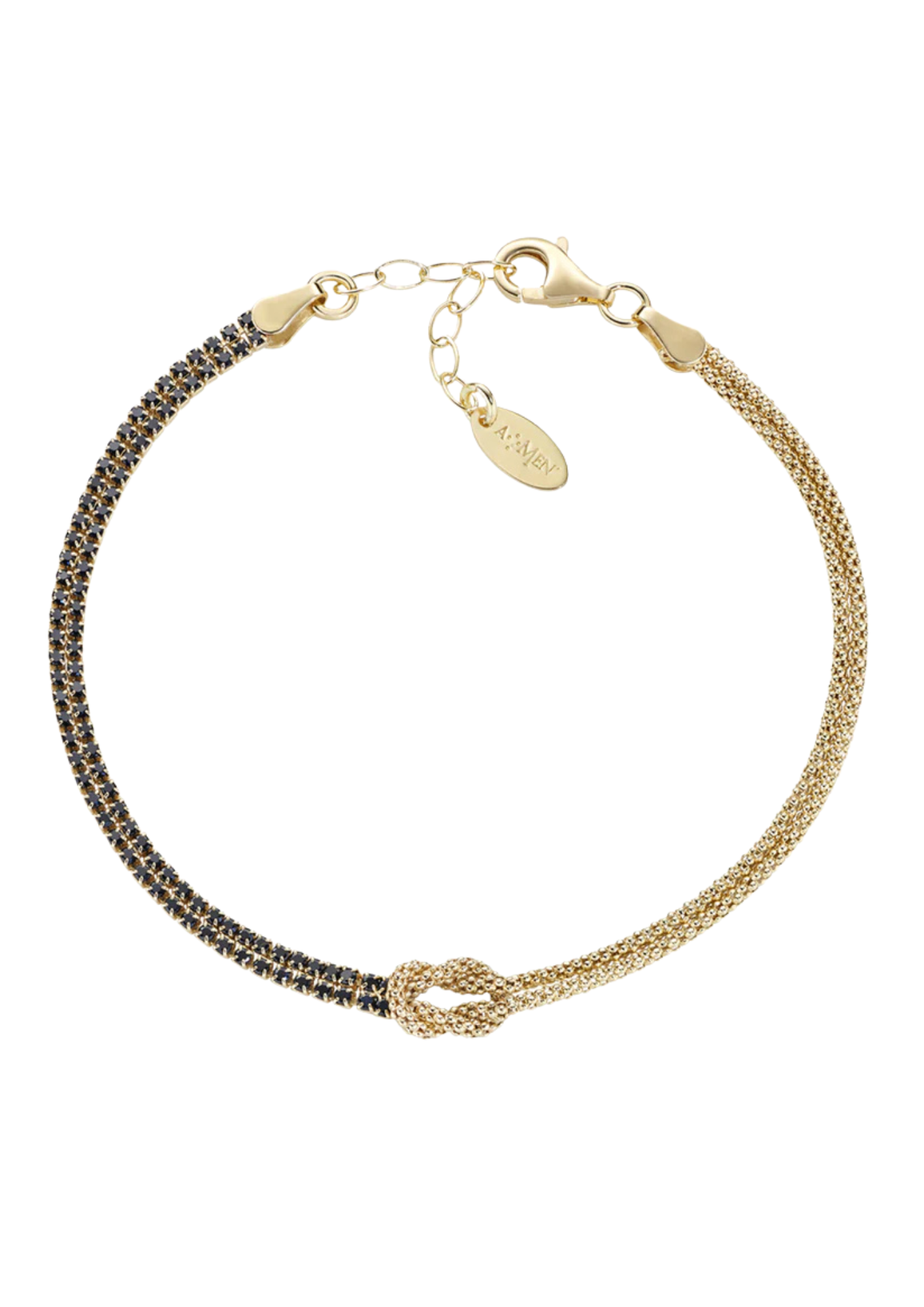 Bracciale in argento 925 dorato con due catene unite a formare un nodo centrale. Una delle catene è un tennis con eleganti zirconi neri. Il Bracciale Nodo d'Amore è il simbolo tangibile di ogni legame indissolubile. Celebra l'intreccio unico con la tua persona del cuore e raccontalo scegliendo il colore che più lo rappresenta!
