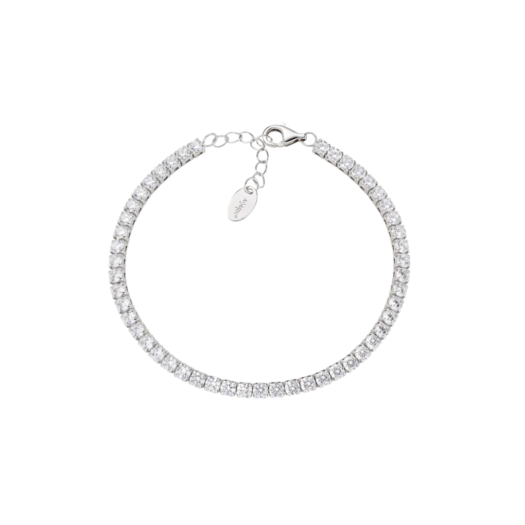 Bracciale tennis in argento 925 rodiato con zirconi bianchi da 3 mm. Lunghezza regolabile da 17 a 20 cm con catenina di allungo e chiusura a moschettone. Luminoso ed elegante, questo bracciale tennis in argento è un must-have per chi vuole brillare ogni giorno!