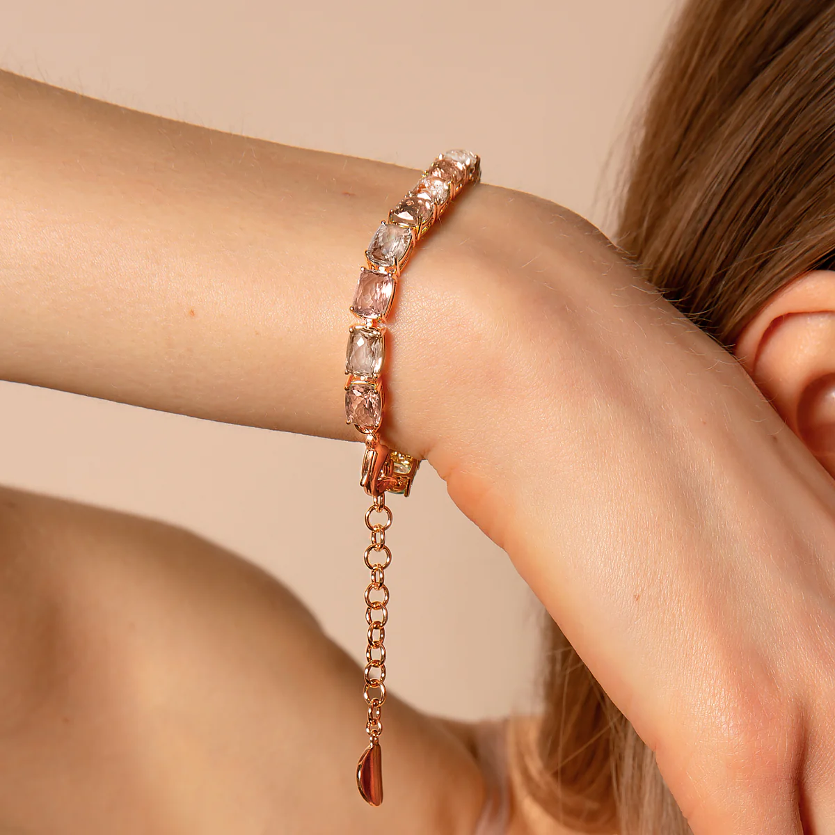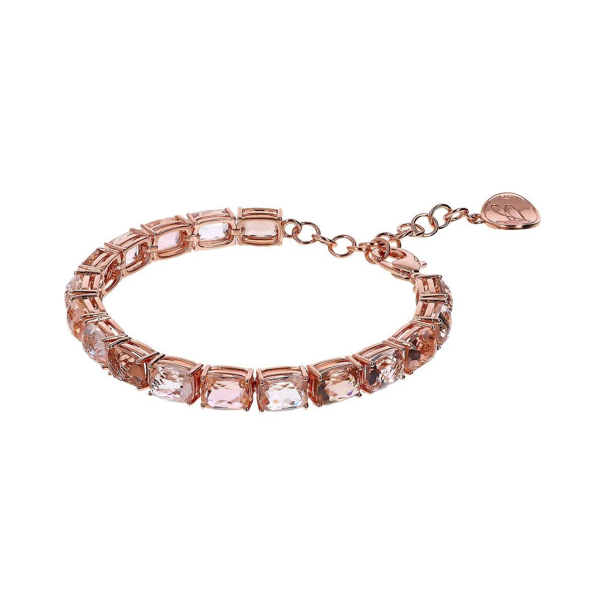 Bracciale Bronzallure realizzato in lega Golden Rosé, placcata Oro rosa 18kt, impreziosito da pietre prisma gem rettangolari (8x11 mm) dal taglio a mosaico. Chiusura a moschettone con extender.