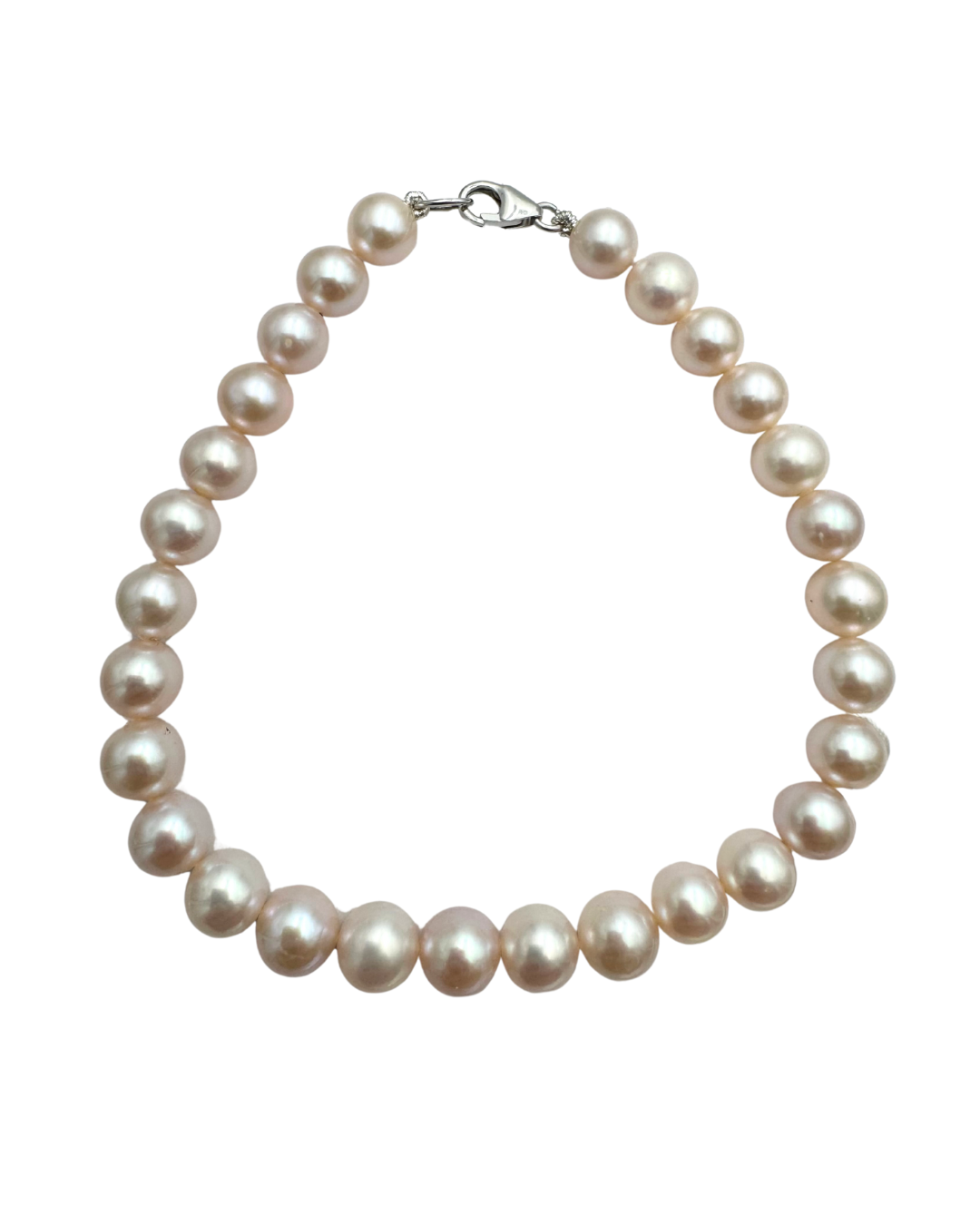 Bracciale con perle d'acqua dolce e chiusura a moschettone in oro bianco 18 KT. Disponibili in diverse grandezze. Lunghezza 20 cm.