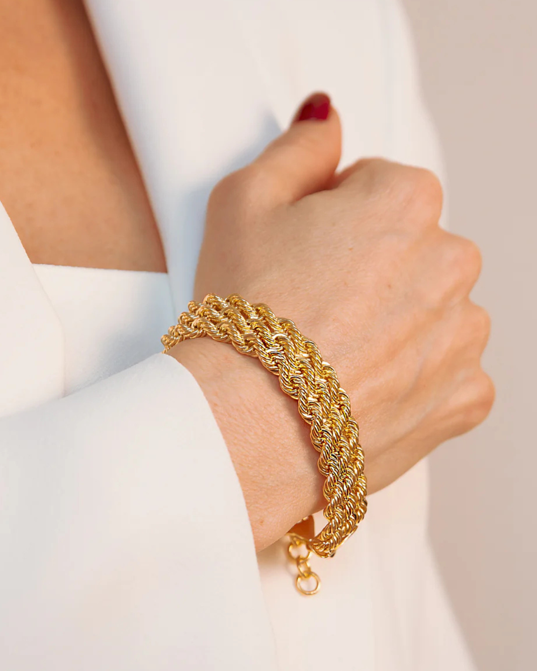 Bracciale Etrusca Gioielli realizzato in lega Golden, placcata Oro giallo 18kt, con doppia catena corda. Lunghezza 19+3 cm di estensione. Chiusura a moschettone. Spessore catena 7 mm.