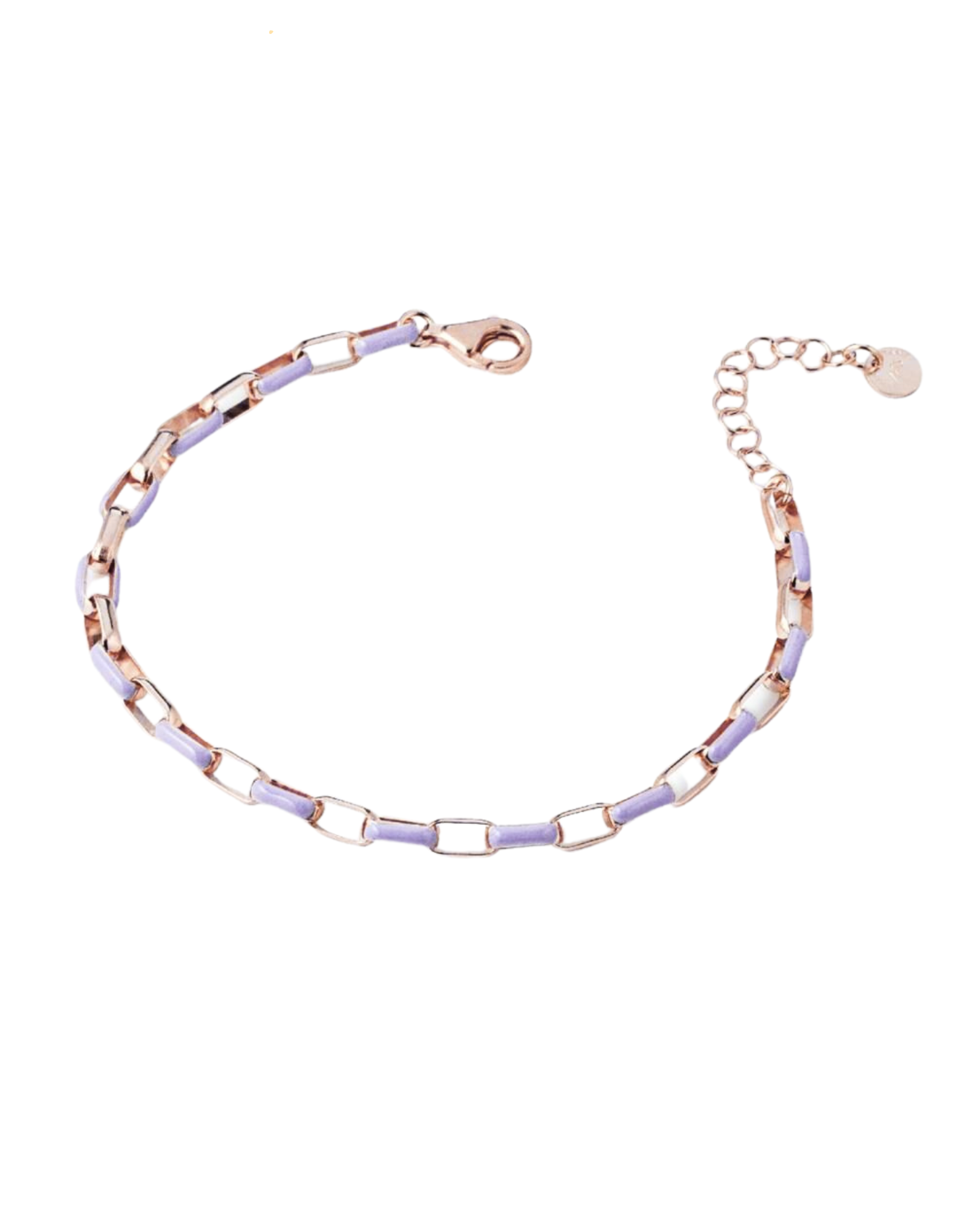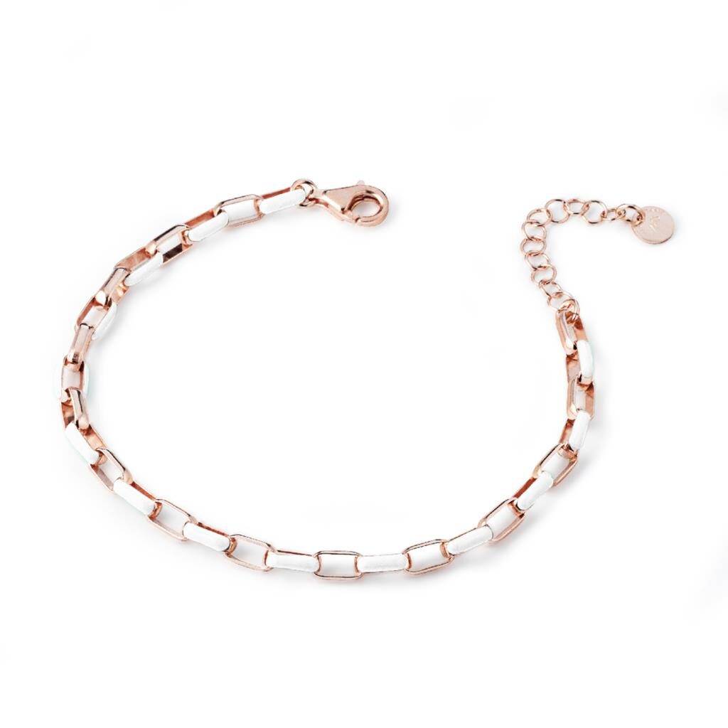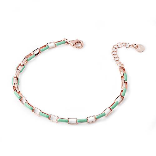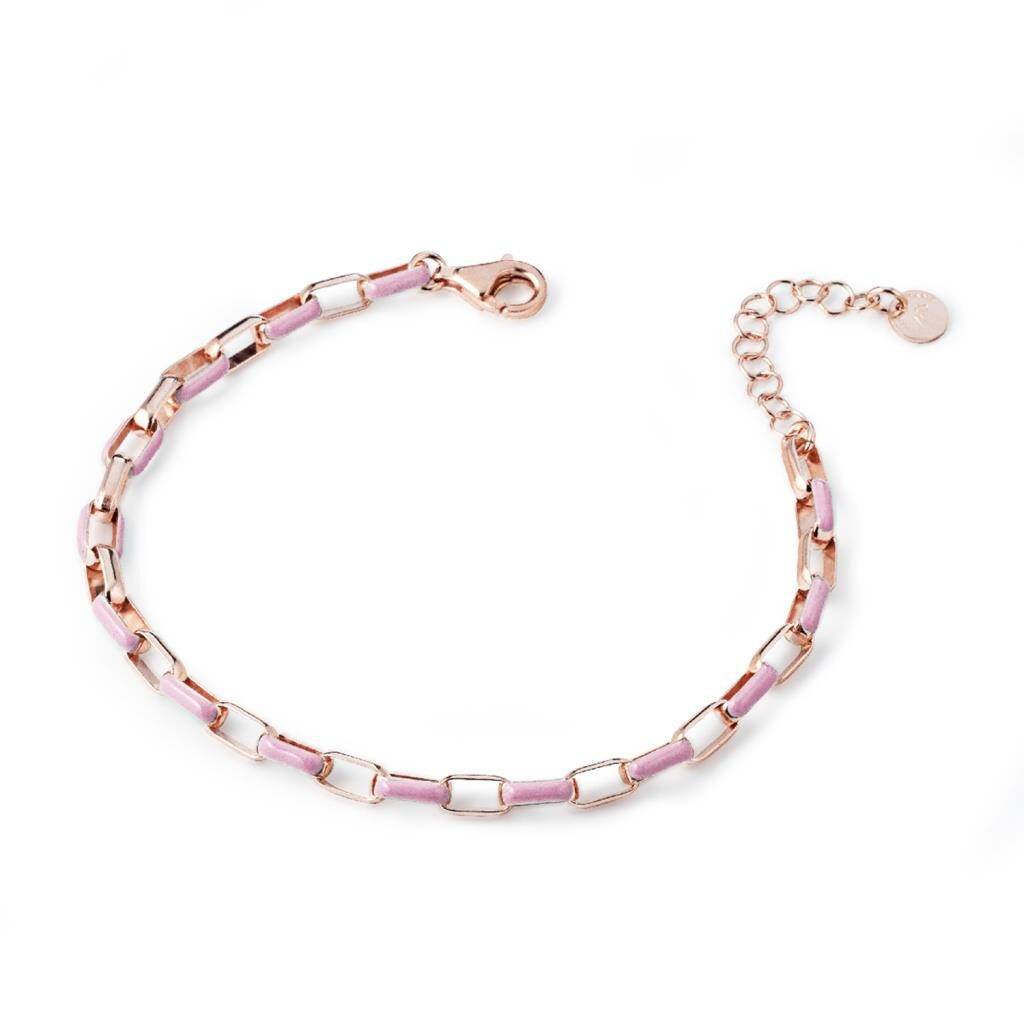 Bracciale con maglia a catena squadrata in argento 925 con galvanica in oro rosa e inserti smaltati. Colori disponibili: rosa, bianco, lilla, verde. Lunghezza bracciale: 17,5 – 20 cm.