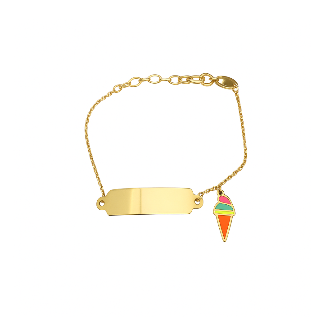 Realizzato in oro giallo 9kt, presenta una raffinata targhettina con un gelato pendente. La catena regolabile da 12 a 15 cm assicura una perfetta vestibilità, rendendo questo bracciale un’idea regalo elegante e significativa.