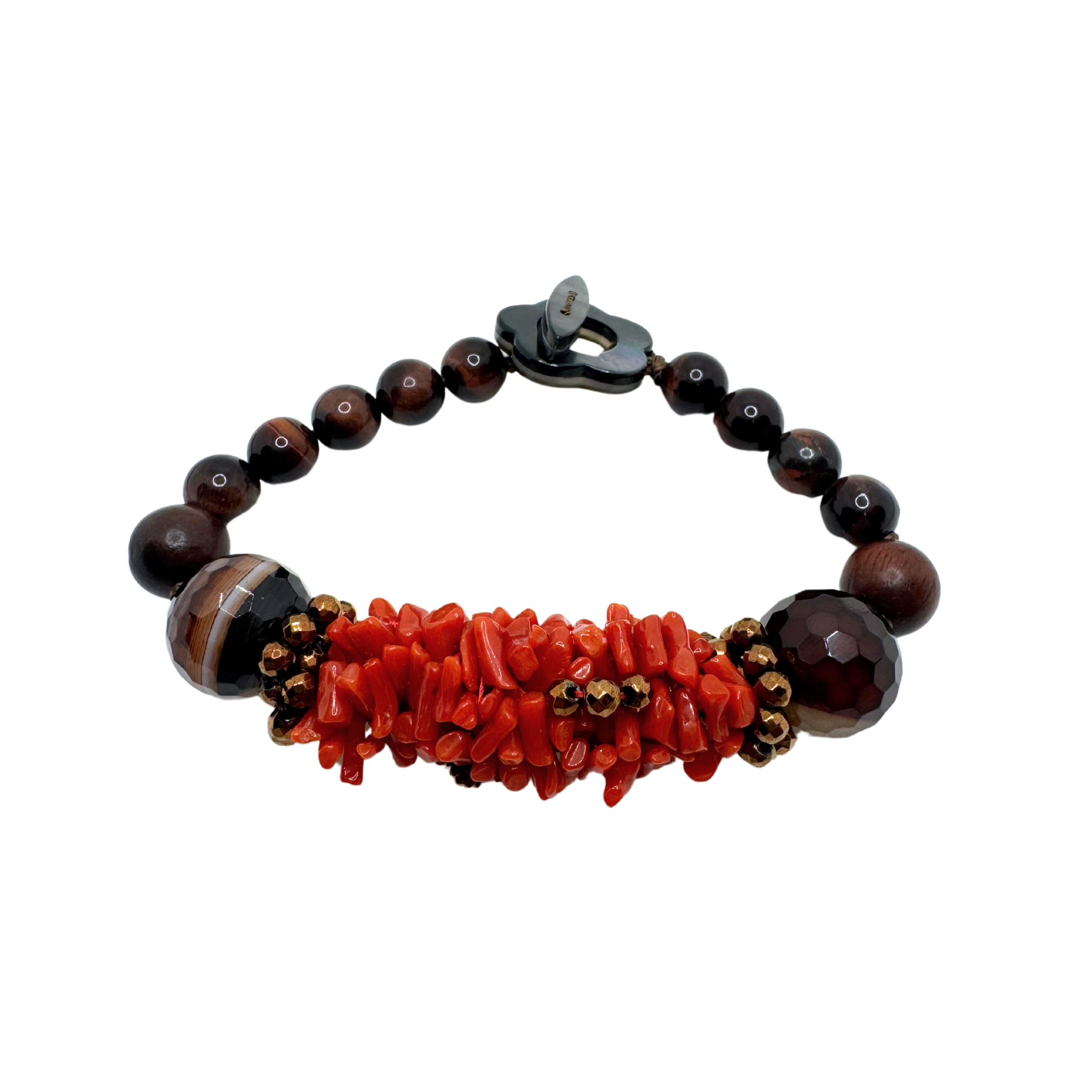 Bracciale della collezione Hula di Rajola con occhio di tigre rosso, corallo rosso, agata rossa, legno, ematite marrone. Chiusura in madreperla con logo in oro giallo18 kt.