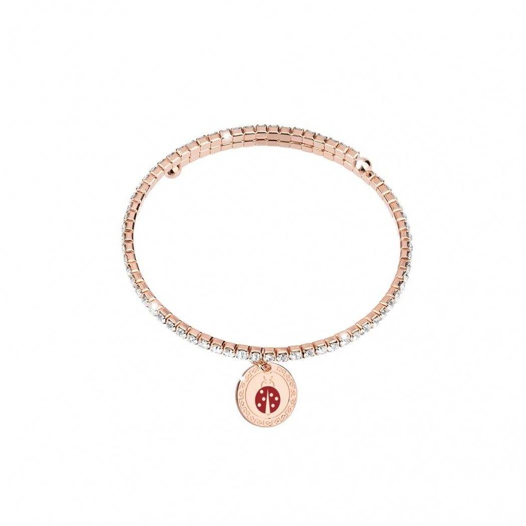 Bracciale da donna di Rebecca della collezione my world. Gioiello in bronzo placcato oro rosa e zirconi di colore bianco. Misura: taglia unica. Chiusura: aperta. Pendente coccinella.