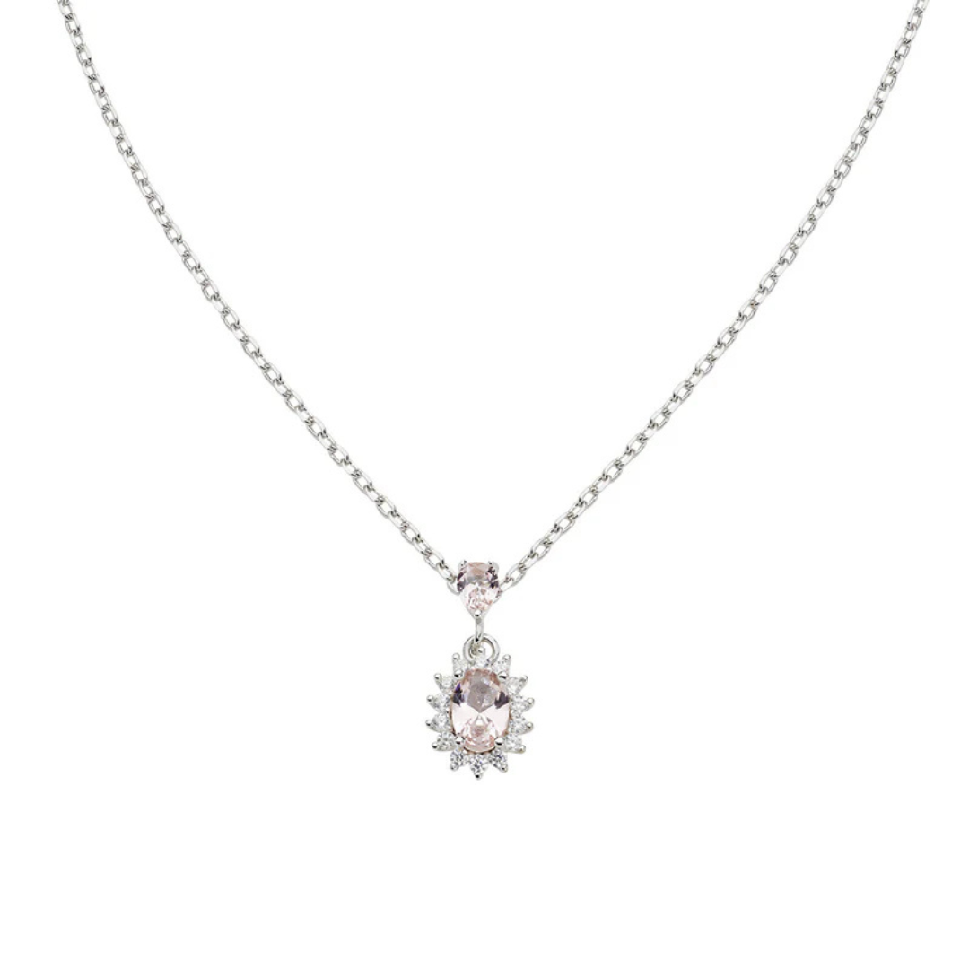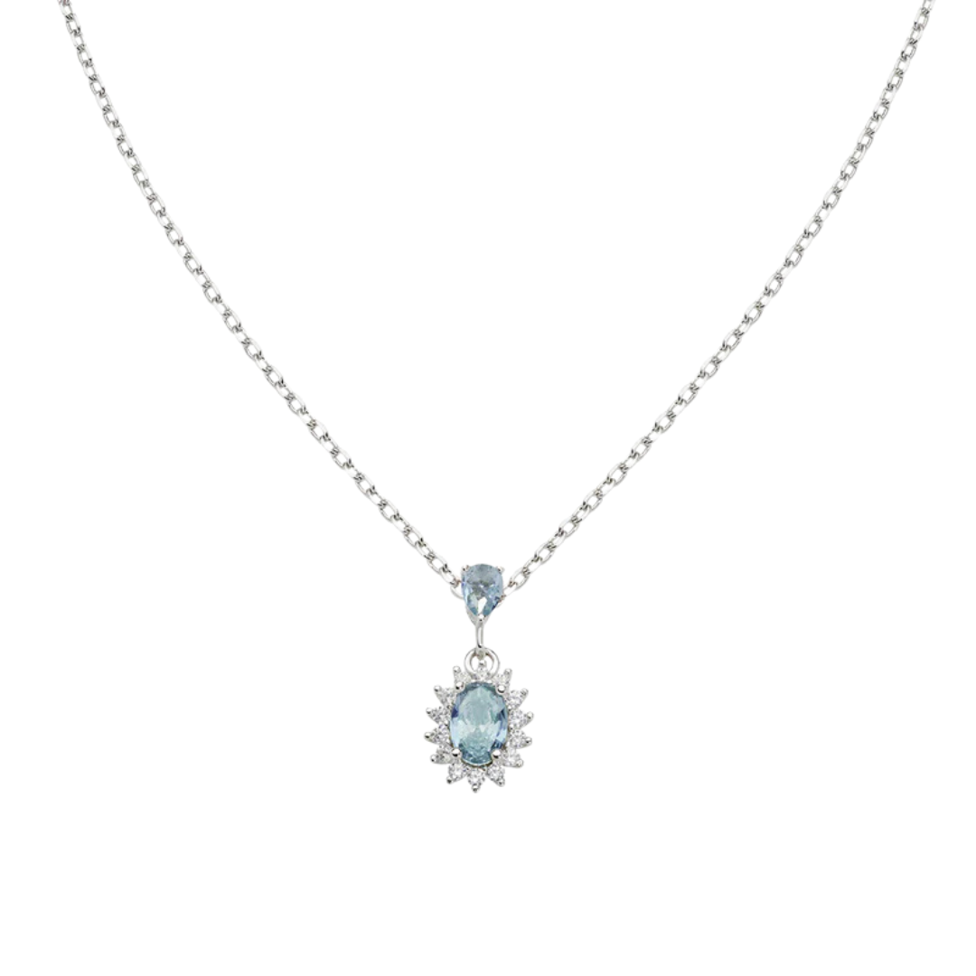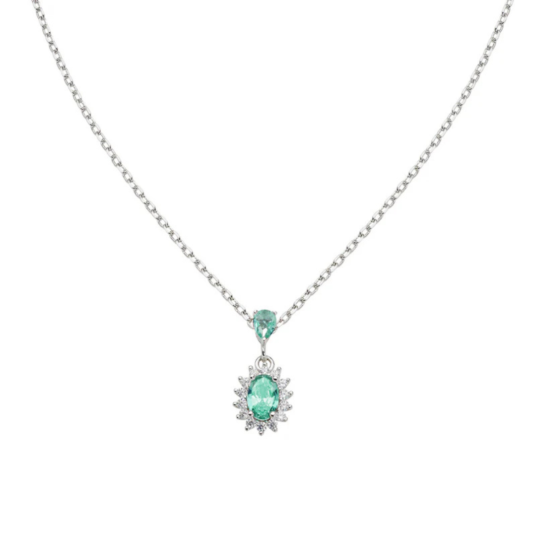 Collana in argento 925 rodiato, pendente a cestello con zircone taglio ovale 6 x 4 mm e corona di zirconi bianchi, sormontato da zircone a goccia. Altezza totale del charm: 1,4 cm. Lunghezza regolabile da 40 a 45 cm con allungo e chiusura a moschettone. Colori diversi disponibili.