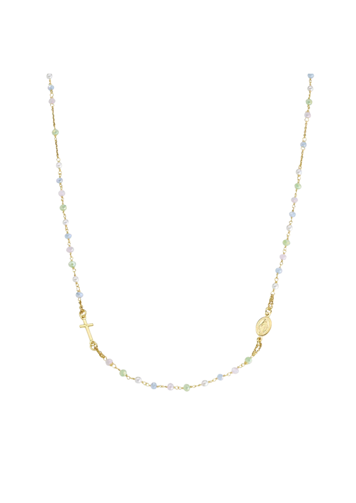 Rosario girocollo in argento 925 con grani da 3 mm di cristalli sfaccettati rosa, verdi e azzurro pastello alternati a perle di cristallo bianche, croce e medaglietta rappresentante la Madonna Miracolosa. La collana ha lunghezza regolabile da 50 a 52 cm con chiusura a moschettone e catenina di allungo.