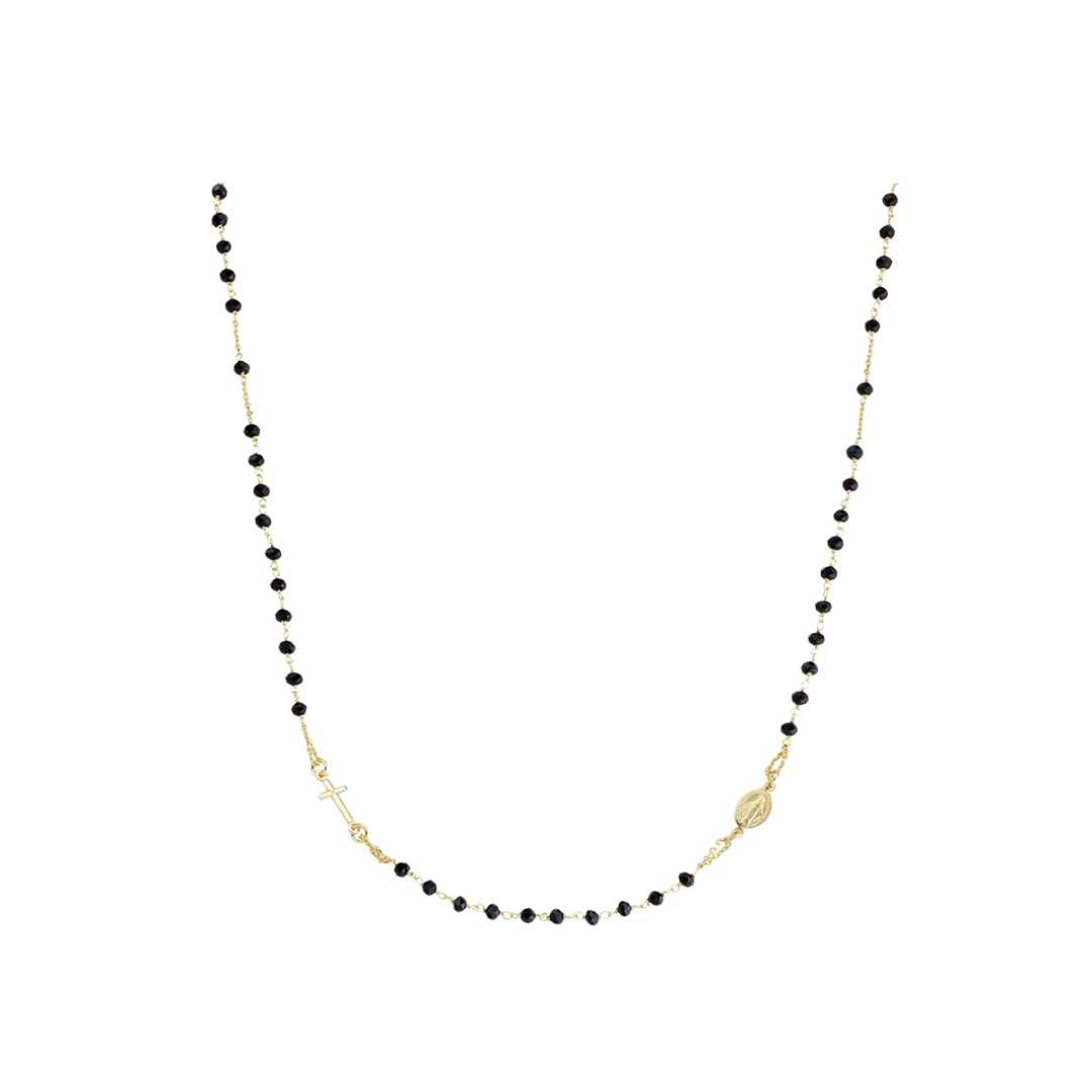 Rosario girocollo in argento 925 con grani da 3 mm di cristalli neri sfaccettati, croce e medaglietta rappresentante la Madonna Miracolosa. La collana ha lunghezza regolabile da 50 a 52 cm con chiusura a moschettone e catenina di allungo.