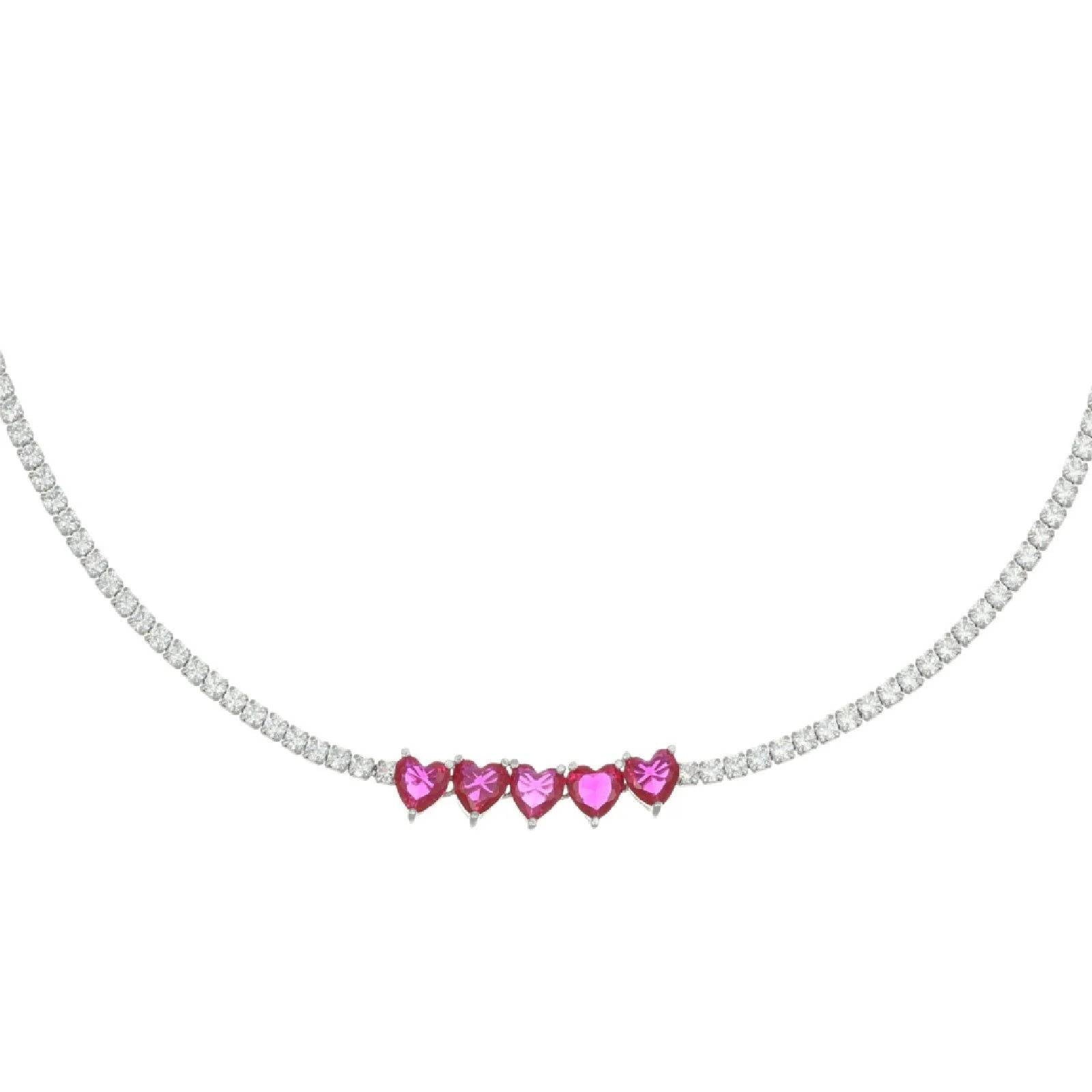 Collana in AG925 con zirconi rossi taglio cuore zirconi bianchi - Rodio - Lungh. 38 + 5 cm - cuori ⌀ 4 mm