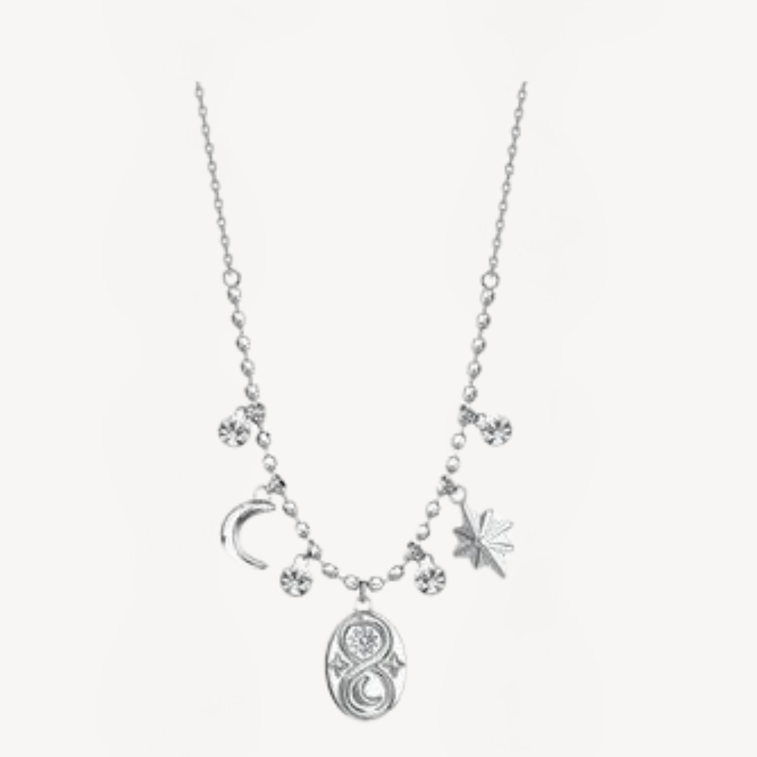 Collana in acciaio 316L, con medaglietta infinito, rosa dei venti, luna e cristallo.