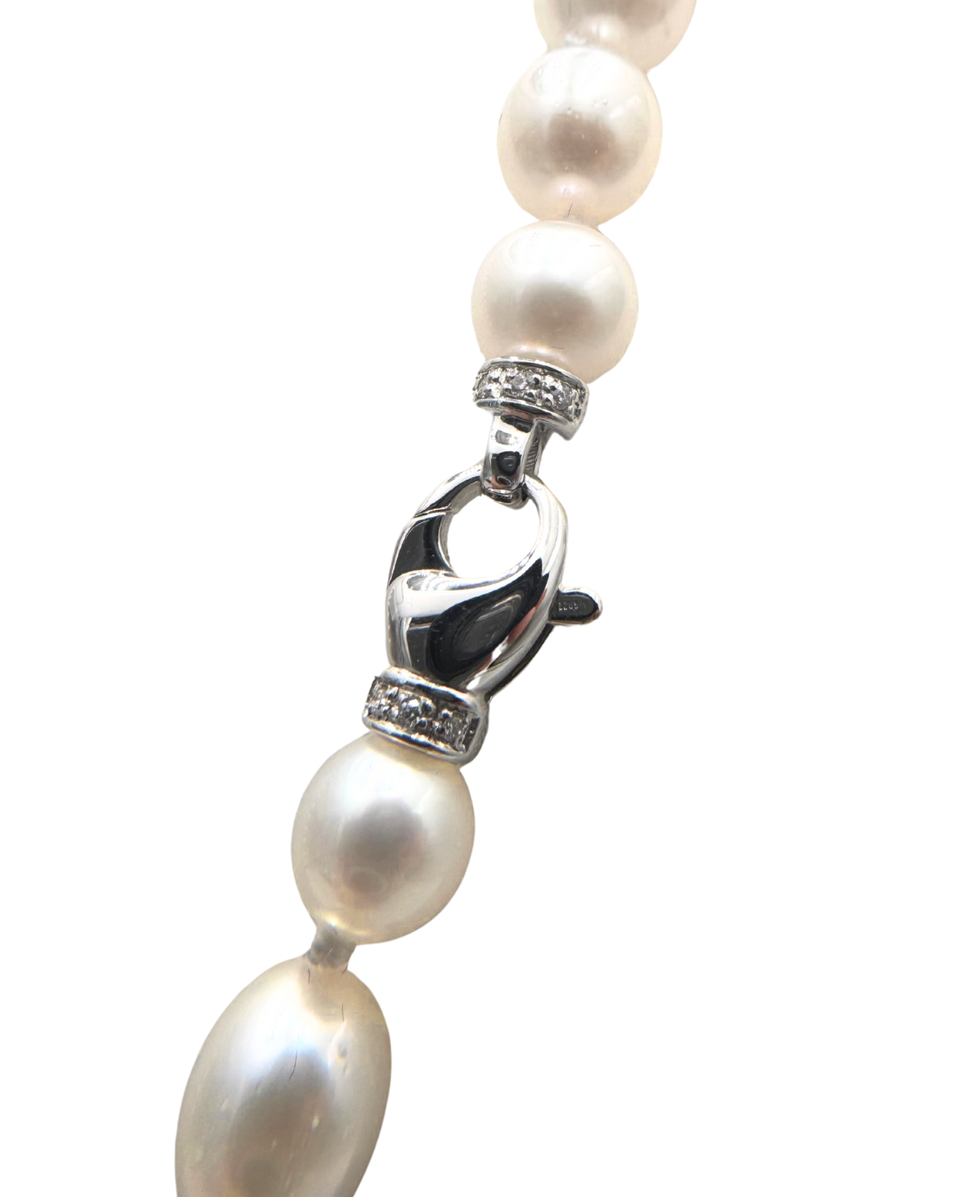 Collana con Perle Akoya 7/7,5 mm con Moschettone in Oro Bianco 18 KT e Brillanti ct 0,06 G VS. Lunghezza 45 cm.