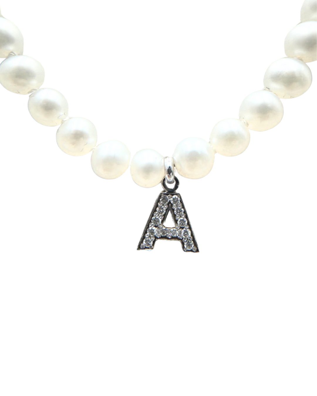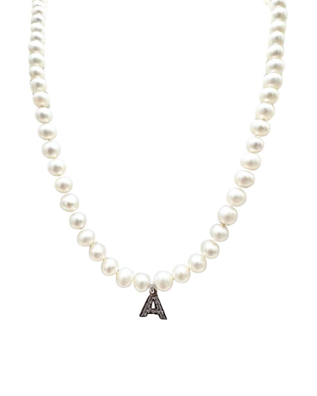 Collana con Perle d'Acqua Dolce 4/4,5 mm con Moschettone in oro bianco 18 KT e Ciondolo in Oro Bianco KT e brillanti ct. 0,09 G VS. Lunghezza 45 cm.