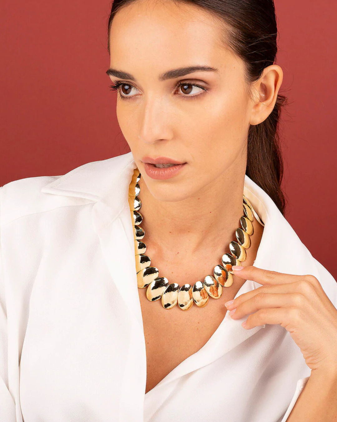 Collana Etrusca, collezione Mirage, con Ovali lucidi martellati in Lega Nobilitata (Argento + Bronzo) Placcata in Oro 18K. Lunghezza regolabile 40-45 cm.