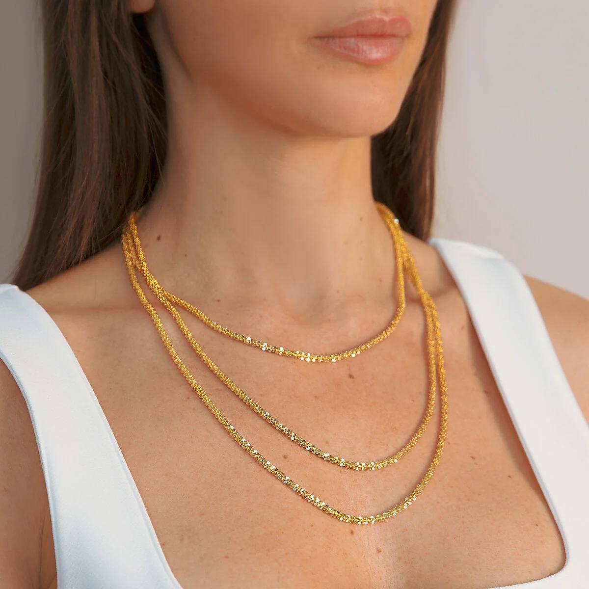 Collana multi-filo graduata realizzata in lega Golden, placcata oro giallo 18kt, con triplo filo di catena margherita sottile. Chiusura a moschettone.