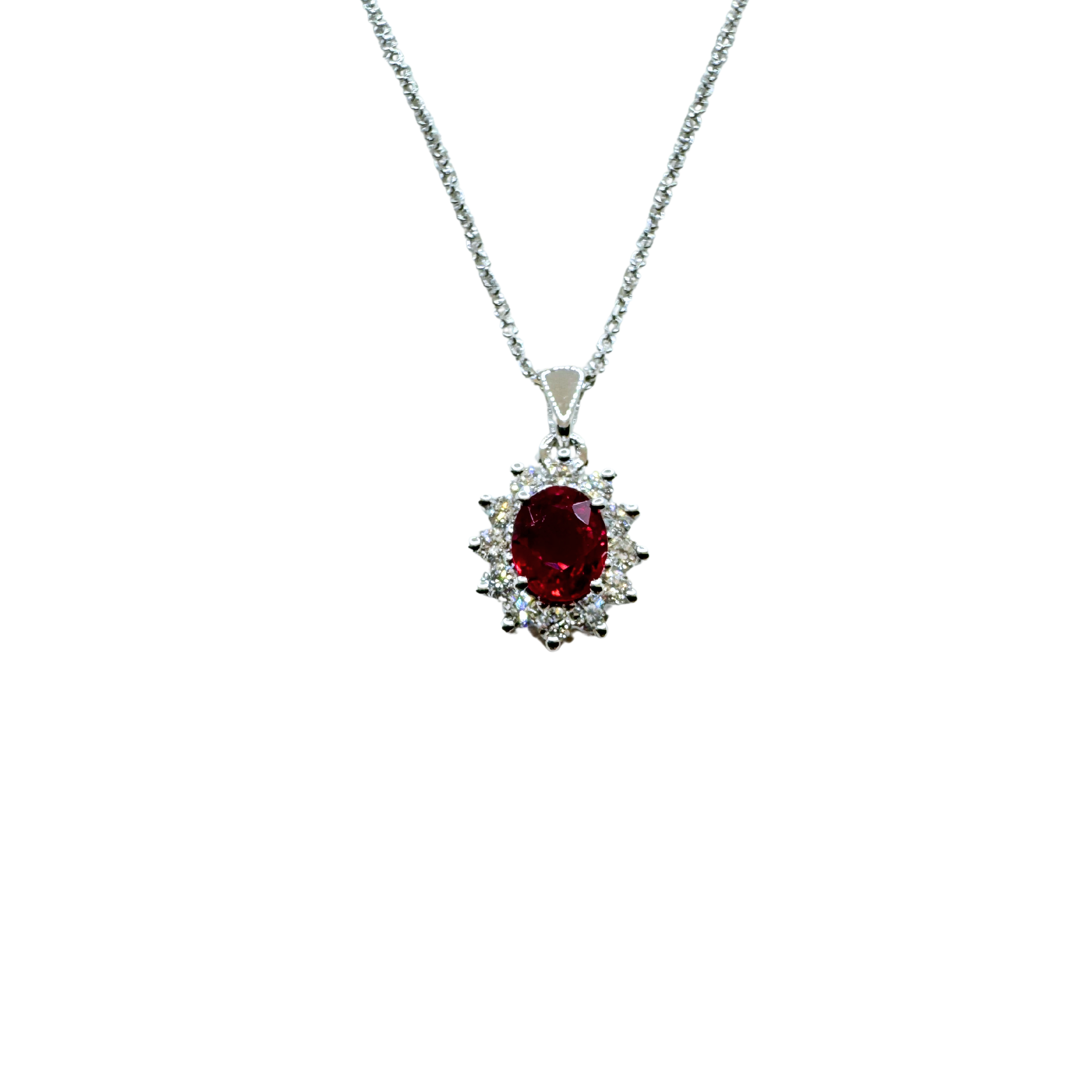 Collana Golay in Oro Bianco con Pendente con Rubino Taglio Ovale e Contorno di Diamanti