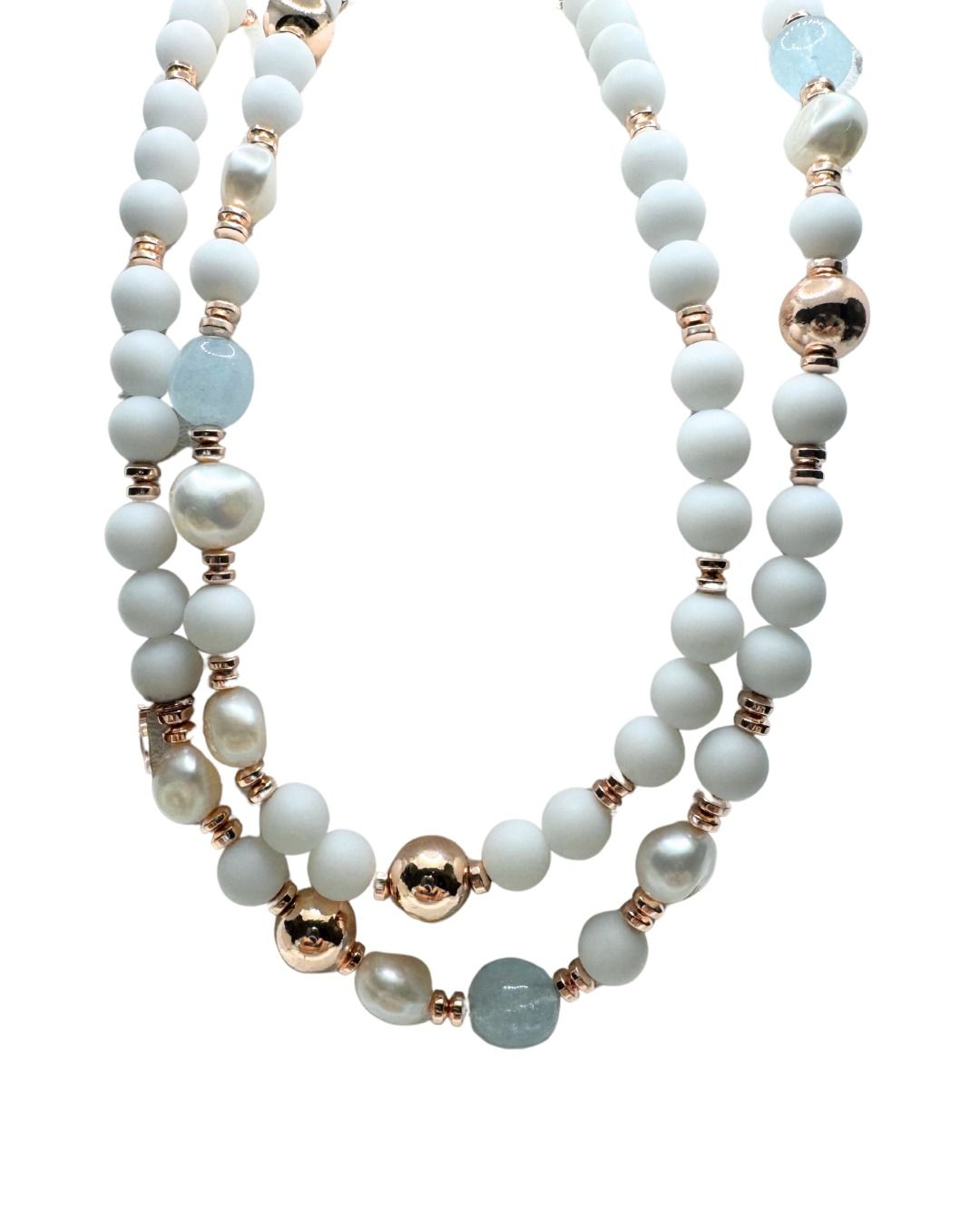 Collana Lelune lunga in argento 925 rosè con Agata bianca, Ematite rosè, perle e acquamarina milk. Lunghezza 90 cm.