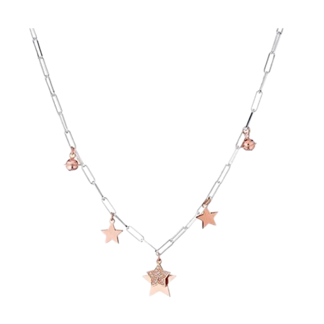 Collana in argento 925 di Marcello Pane della Collezione Petite Boules a catena con stelle rosè pendenti.