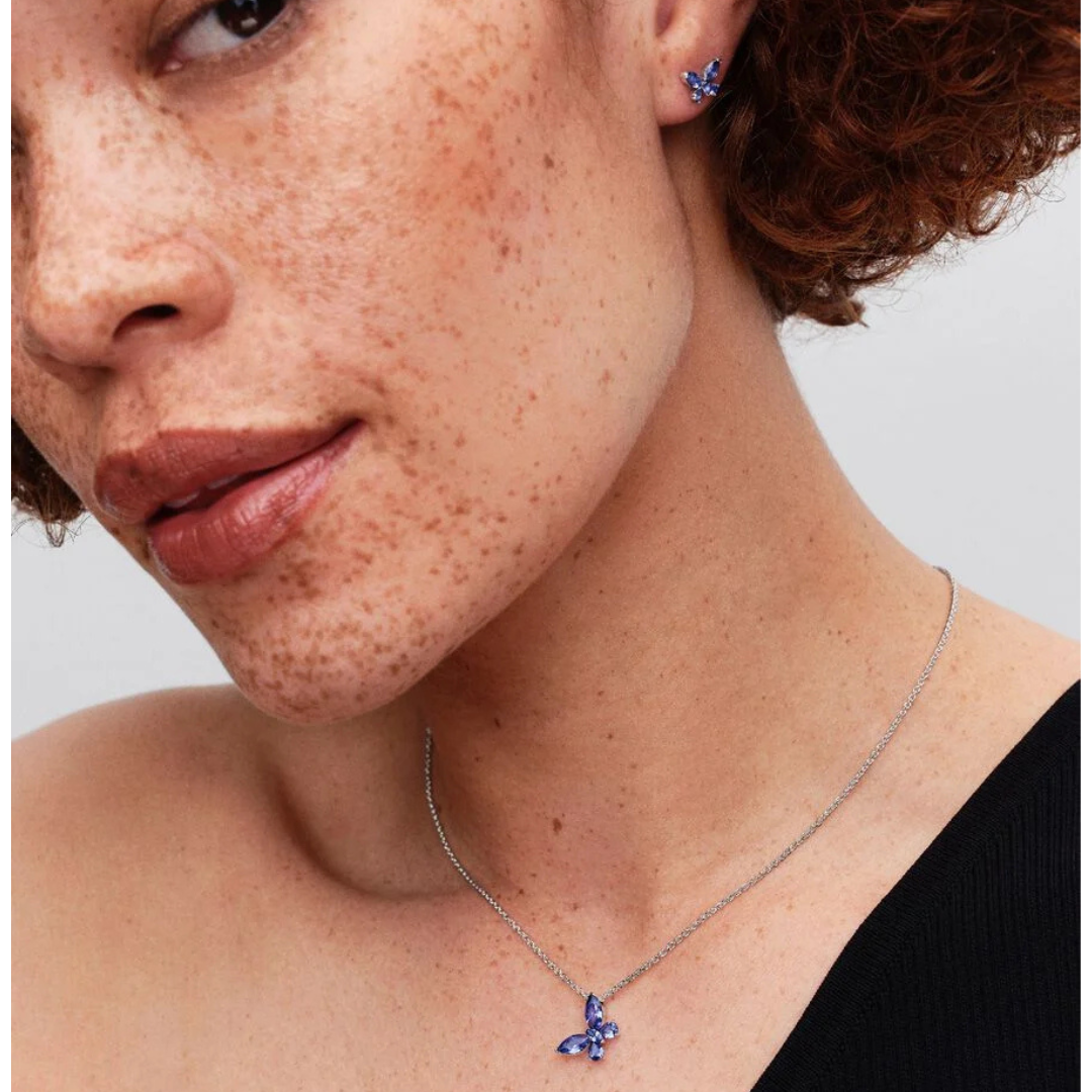 Apri le ali e trasforma il tuo look con questa collana in argento sterling 925. Con cristalli creati dall'uomo blu taglio marquise e a goccia, il gioiello presenta una farfalla che pende con grazia dalla catena.