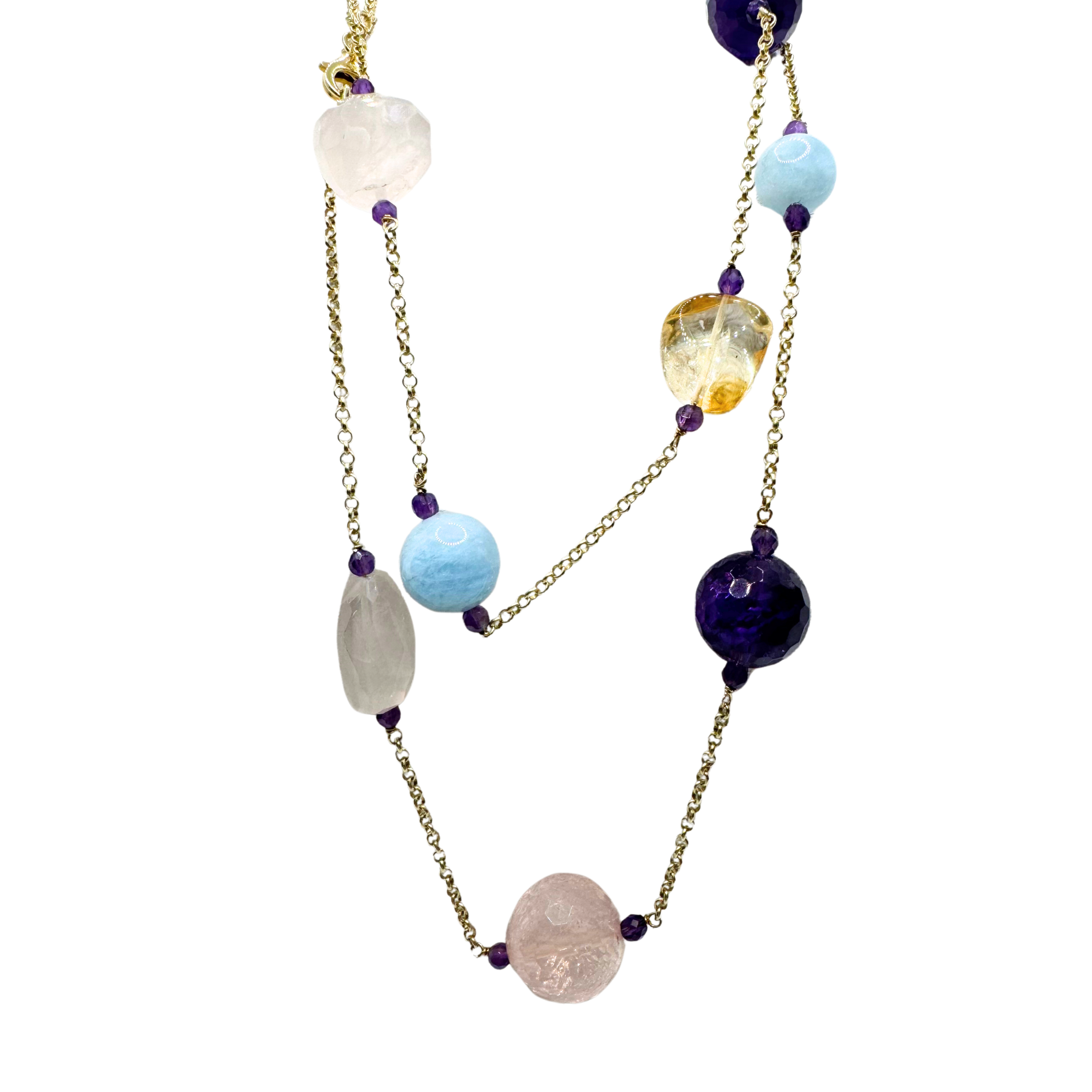 Collana della collezione Amalfi di Rajola con quarzo rosa, citrino, ametista e acquamarina in argento 925. Lunghezza 90 cm.