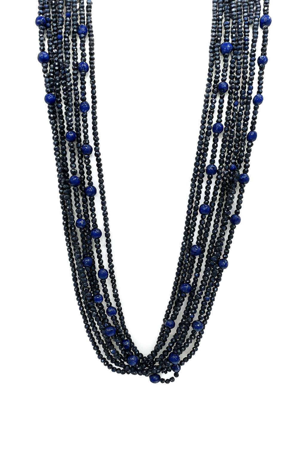 Collana della collezione Valzer di Rajola con spinello blu, lapislazzuli e giada. Chiusura in madreperla con logo in oro giallo 18 kt. Lunghezza 90 cm.