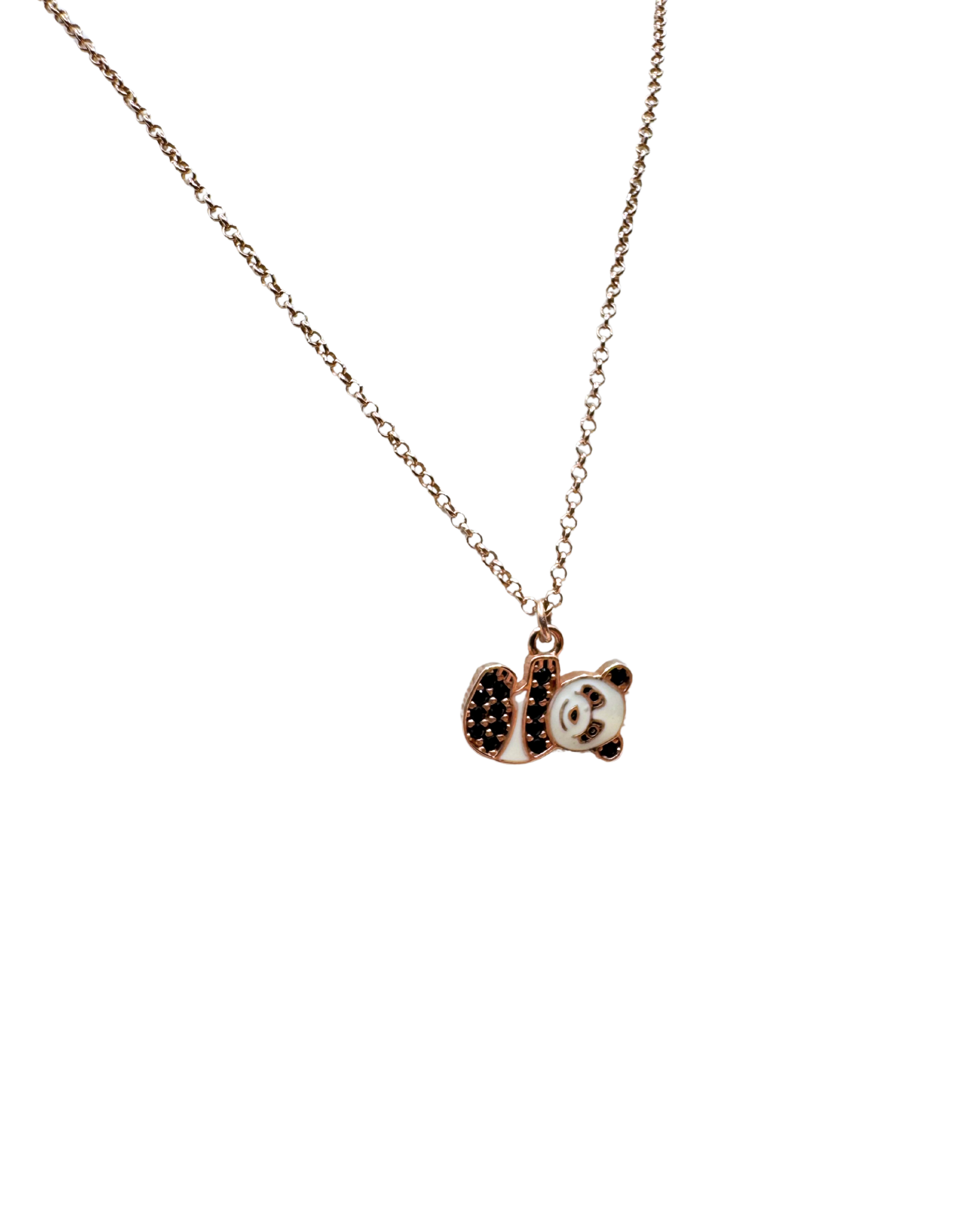 Collana Corona in Argento 925 rosè con panda smaltato panna e zirconi neri, galvanica in oro 18kt. Lunghezza collana: 38,5 cm + 5 cm allungo.