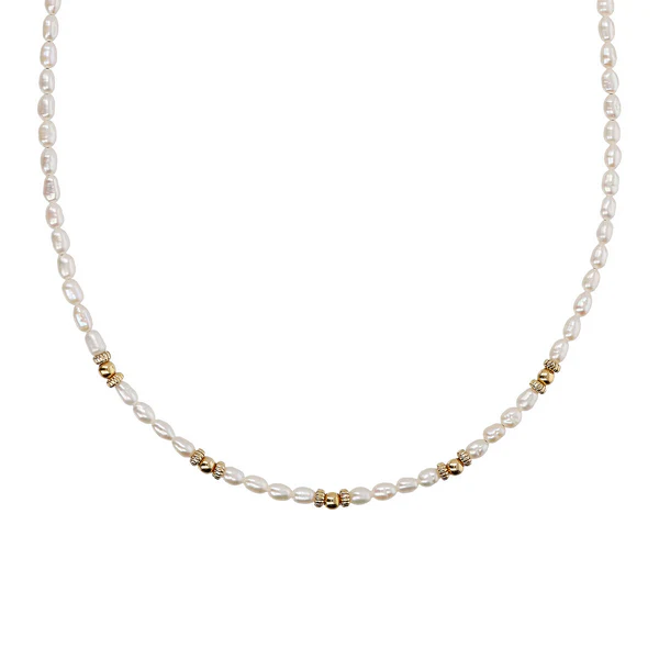 Collana girocollo in Argento 925, placcato oro giallo 18kt, impreziosita da perle a chicco d'acqua dolce alternate a sfere golden. Chiusura a moschettone.