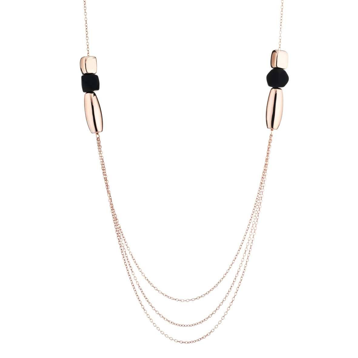 Collana chanel in argento 925 con tre catene e modulo di elementi speculare in argento rosè 925 e con boule in metallo con effetto soft touch, tipico della collezione Rubber. La collana è lunga cm 84 più 3 cm di prolungamento per poter regolare la lunghezza a proprio piacimento.