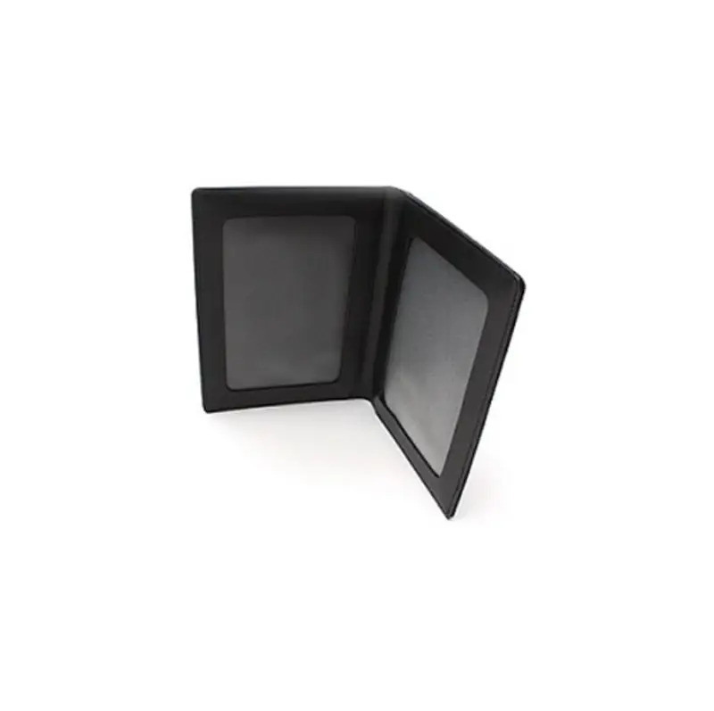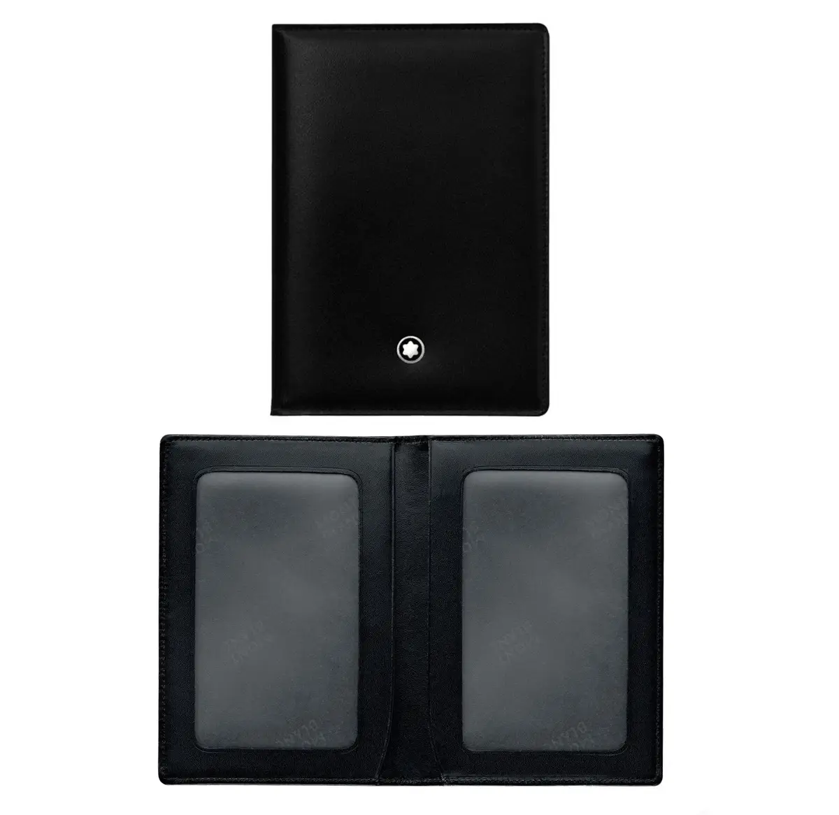 Custodia tascabile per documento d’identità in vitello pieno fiore proveniente dal sud della Germania, nero lucido Montblanc, concia al cromo, tintura passante alla semianilina, 2 tasche a vista per documento d’identità e altro documento di uguale dimensione.