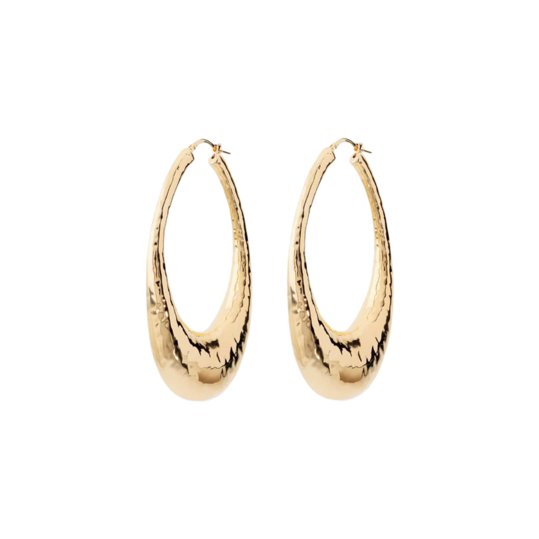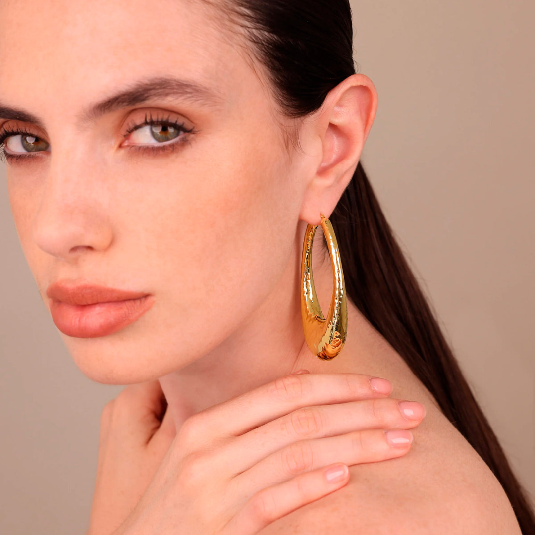 Orecchini Etrusca da donna, collezione Luce Mediterranea, realizzati in lega golden placcata oro giallo 18 carati. Orecchini a cerchio pendenti dalla superficie martellata, realizzati con tecnica elettroformata, che consente di ottenere un volume importante senza rinunciare alla comodità.
