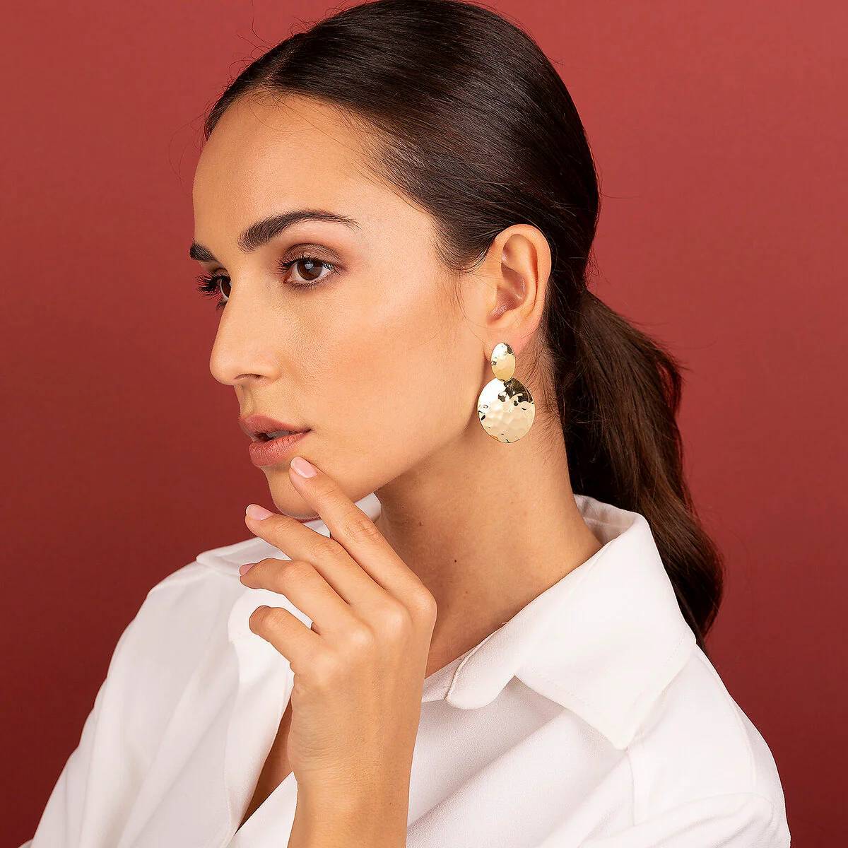 Orecchini da Donna della Marca Etrusca Gioielli, il gioiello è realizzato in Lega Golden. La coppia è formata da due dischi ovali a sfoglia sovrapposti l'uno su l'altro con lavorazione martellata. La lunghezza è di 3,5 cm. La chiusura è con vitarella al perno.