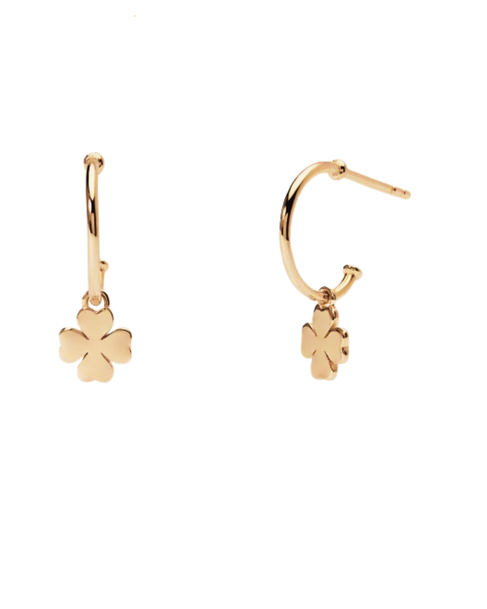 Orecchini a cerchio con vite in argento 925 con galvanica rosè di Marcello Pane. Gli orecchini presentano come soggetto pendente un quadrifoglio portafortuna.