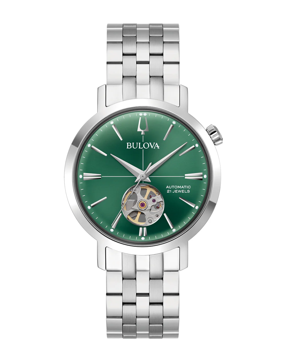 Cassa in acciaio inossidabile con corona color argento in posizione delle due ore, quadrante grigio ad apertura aperta con lancette e pennarelli d'argento, retro della cassa da esposizione, movimento automatico a carica automatica a battito cardiaco con riserva di carica di 40 ore, vetro minerale in scatola, bracciale in acciaio inossidabile con chiusura a fibbia in tre pezzi e resistenza all'acqua fino a 30 metri.