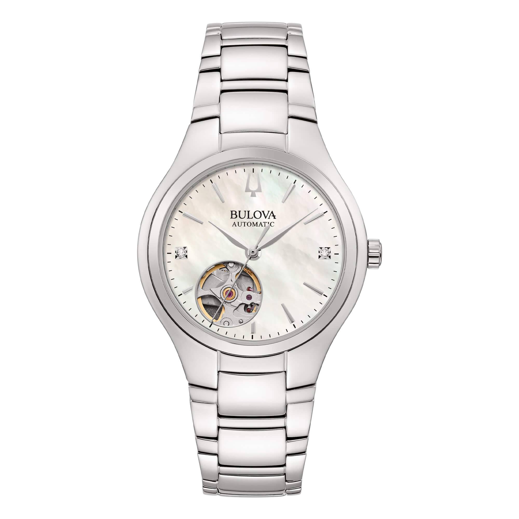 Il Bulova Classics 96P247 è dotato di una cassa in acciaio dal diametro 34.0 mm e spessore 10.7 mm. Il suo quadrante è in madreperla bianca con 2 diamanti ed apertura heartbeat a ore 7.Mentre a protezione del quadrante è presente un vetro minerale piatto, fondello a vista.Viene alimentato da un movimento automatico con funzione tempo e data.Bracciale in acciaio a 3 maglie con chiusura deployante a doppio pulsante.Impermeabilità 30 mt