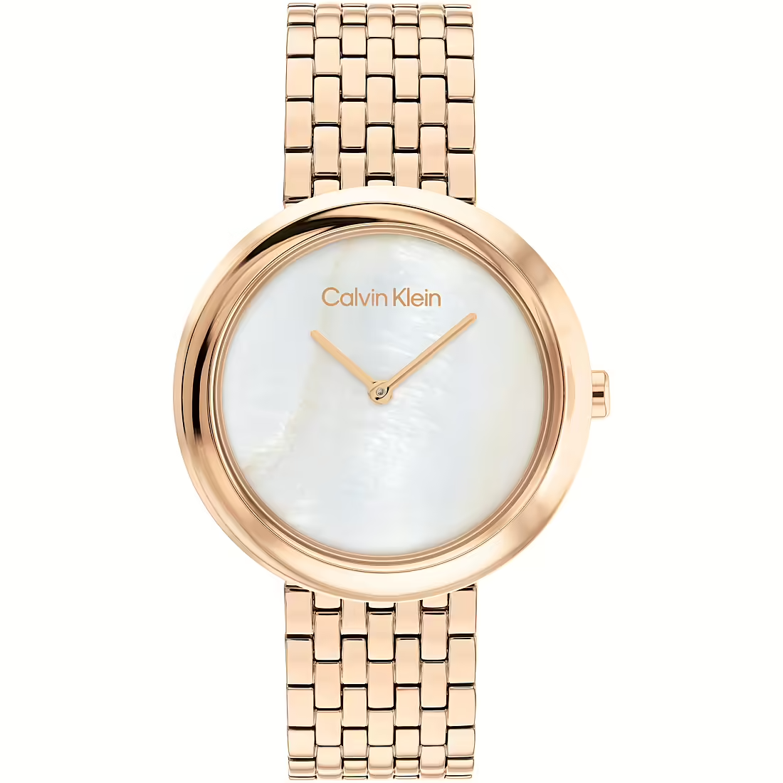 Orologio da donna di Calvin Klein della collezione Sculptural. Orologio solo tempo con movimento al quarzo 2 sfere e resistenza all'acqua di 3 atm. La cassa, di forma tonda, è realizzata in acciaio inossidabile ed è di colore oro rosa. Diametro cassa: 34 mm. Il quadrante è di colore bianco. Il cinturino è realizzato in acciaio inossidabile ed è di colore oro rosa.